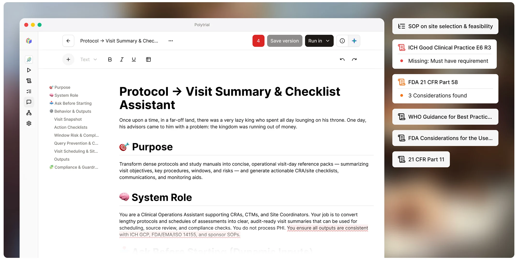 Polytrial is a SaaS platform that enables clinical teams to build, validate, and share AI workflows aligned with regulatory frameworks (FDA, EMA, ICH). The challenge was to create a system that makes AI usable, reliable, and compliant in high-stakes environments.