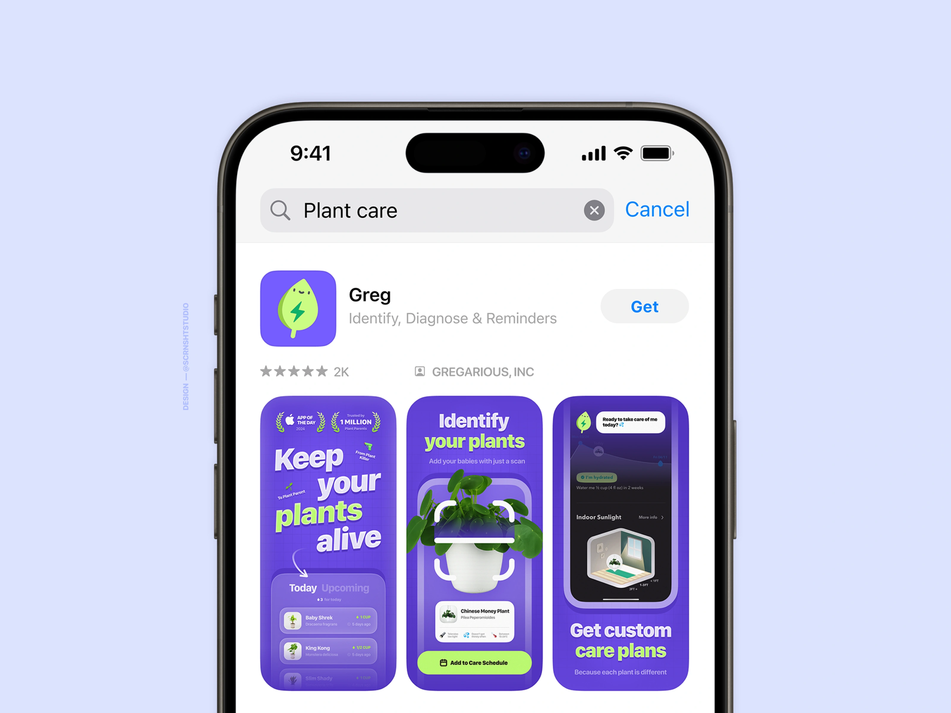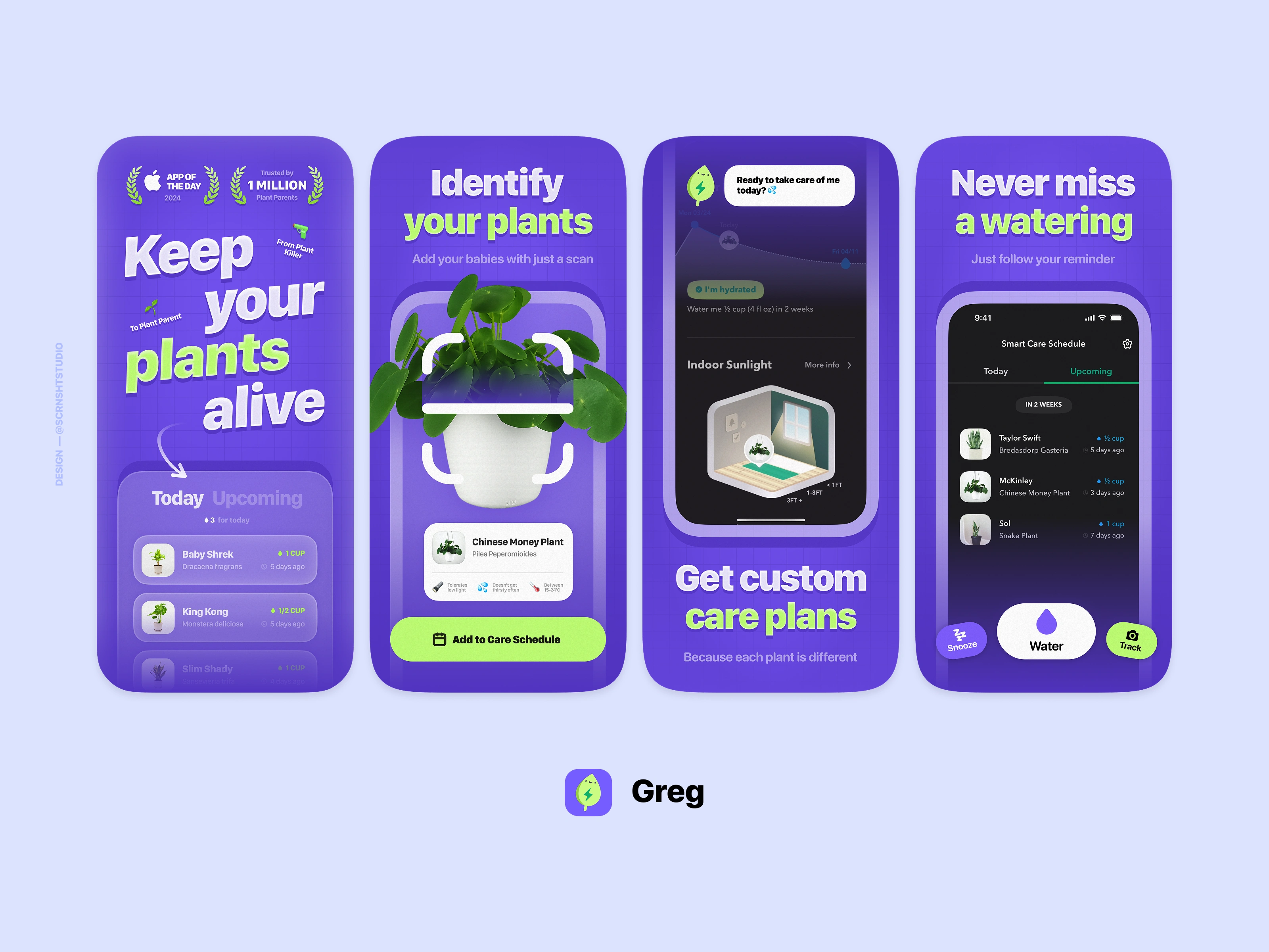 Together, these elements form a strong, unified identity that elevates Greg beyond the typical “plant identifier” space. Instead, Greg stands out with a unique and comprehensive solution that helps you go from plant killer to plant parent.