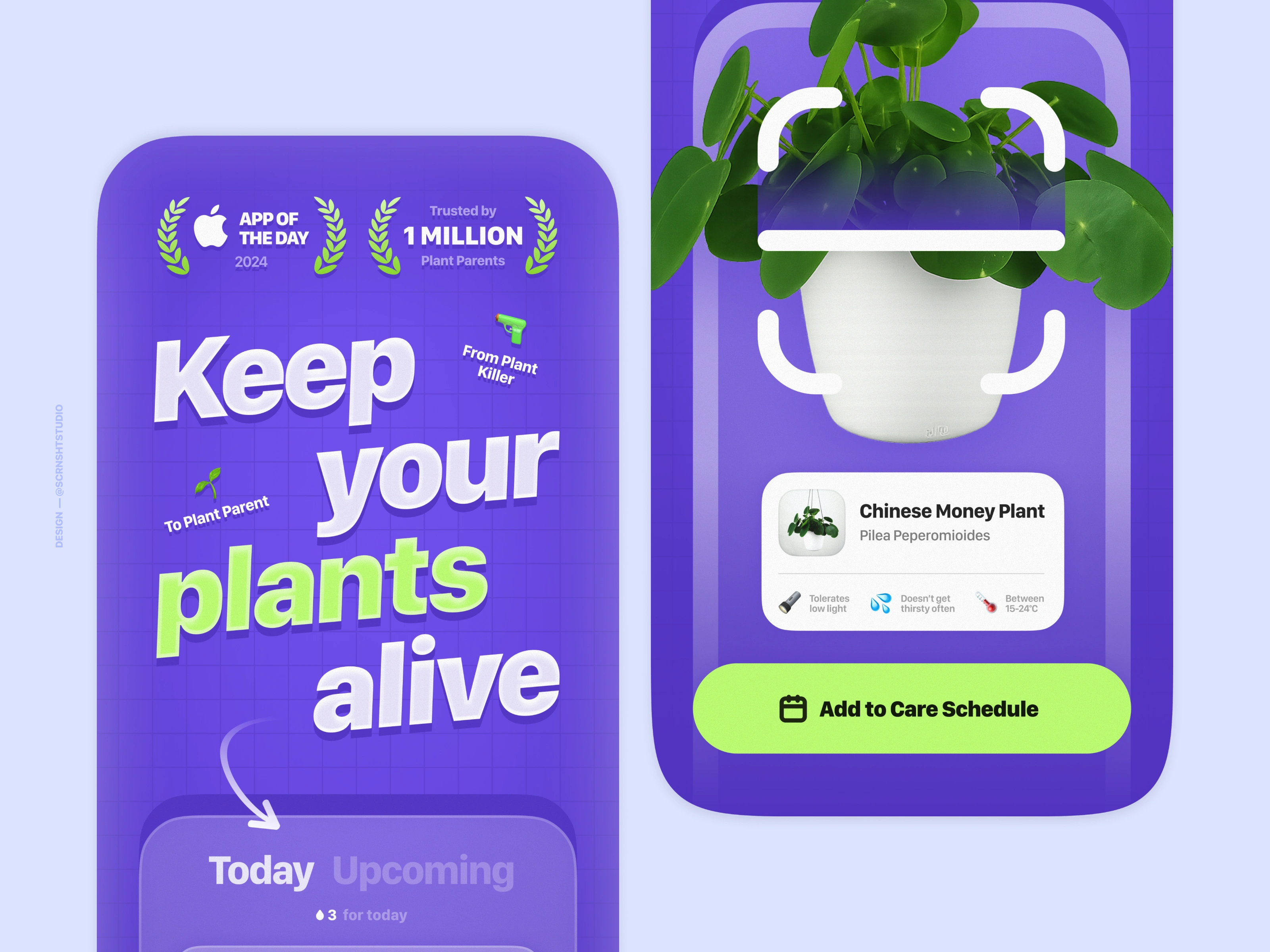 A simple and playful headline “Keep your plants alive”, crafted to speak directly to the audience. A bold, punchy color duo that instantly grabs the eye. And a set of simplified interface visuals designed to prove just how intuitive Greg really is.