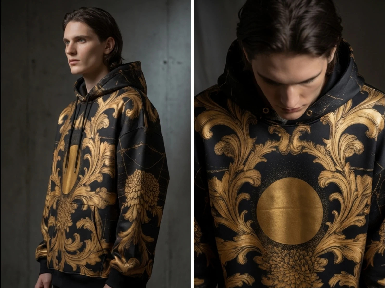 Using AI image generation and video creation, Elittē was created from concept to launch-ready visuals with no physical samples, no photoshoot, no production run. The collection spans hand-painted sumi-e ink wash pieces on cream cotton, gold baroque embroidery on black, celestial star atlas engravings, and flowing landscape art across oversized tees, heavyweight hoodies, and production-ready textile patterns.