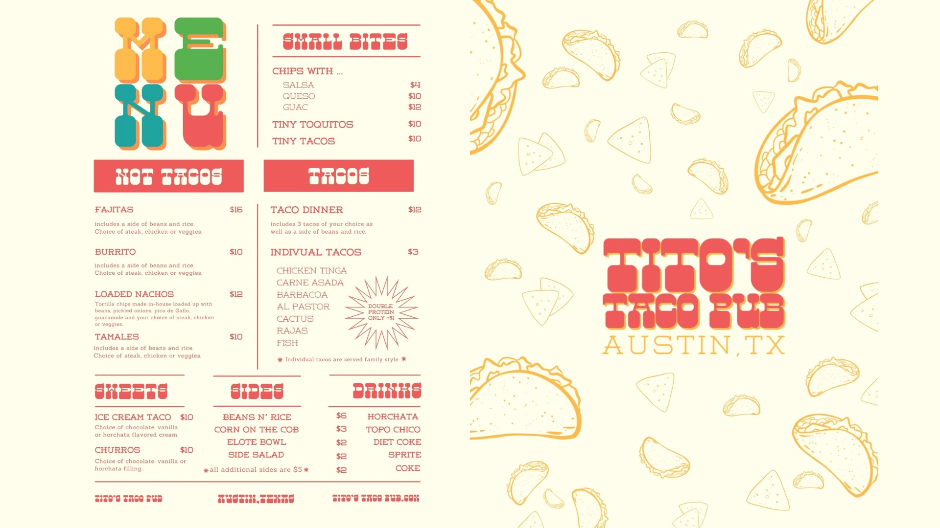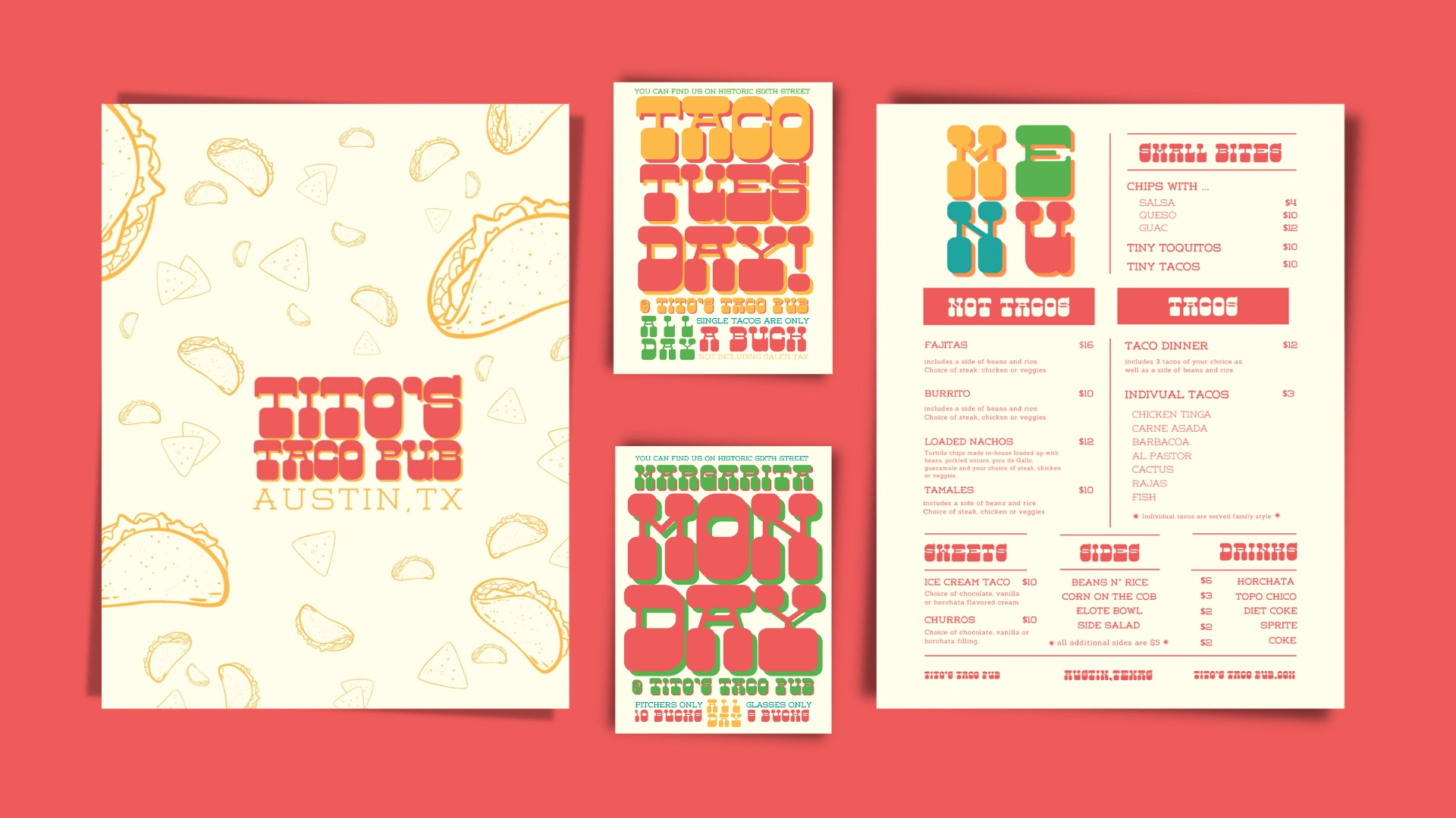 This is the brand guide for Titos Taco Pub. It includes a logo, color palette, menu, and daily specials flyer designs.