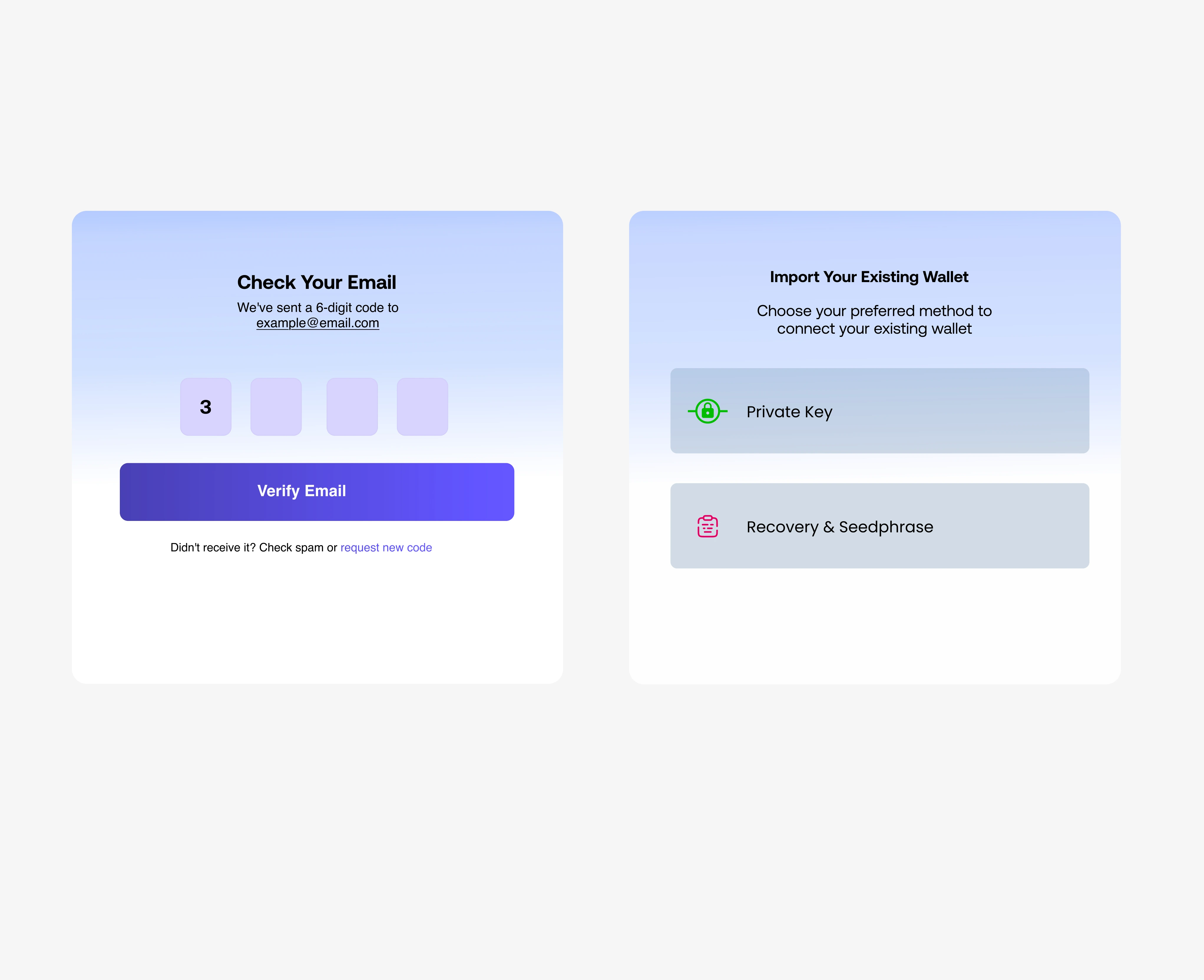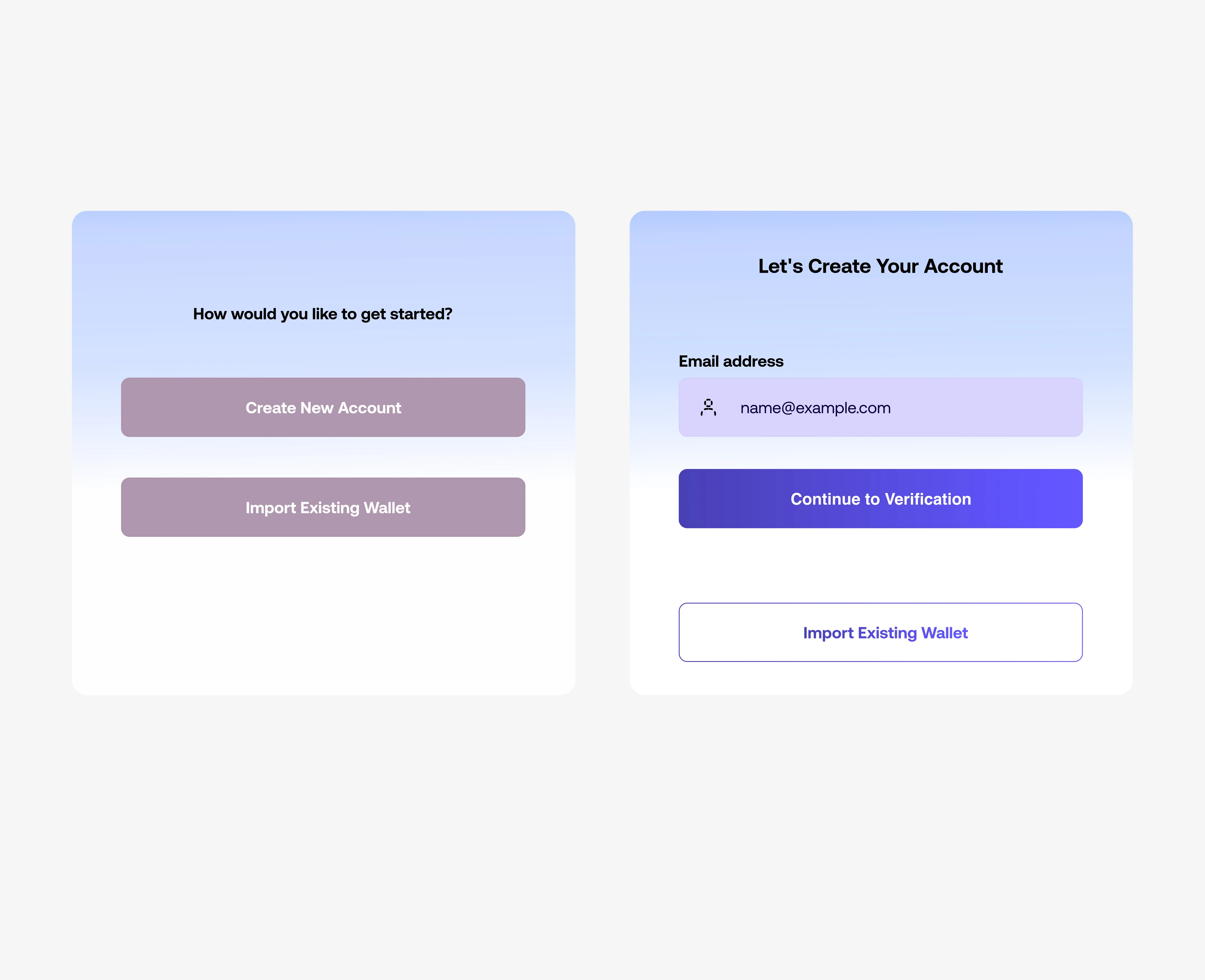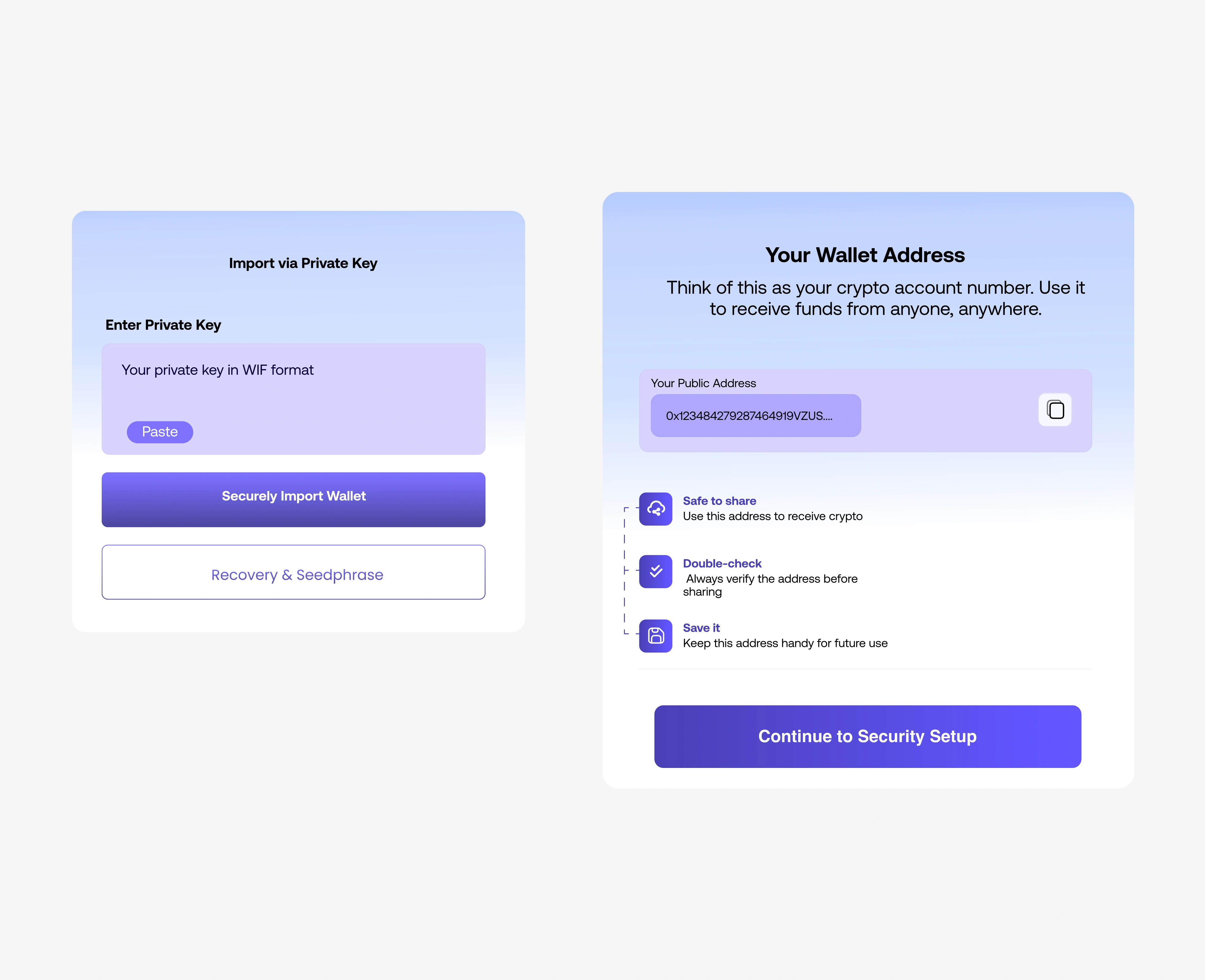 A modern cryptocurrency onboarding interface design focused on user experience and security.