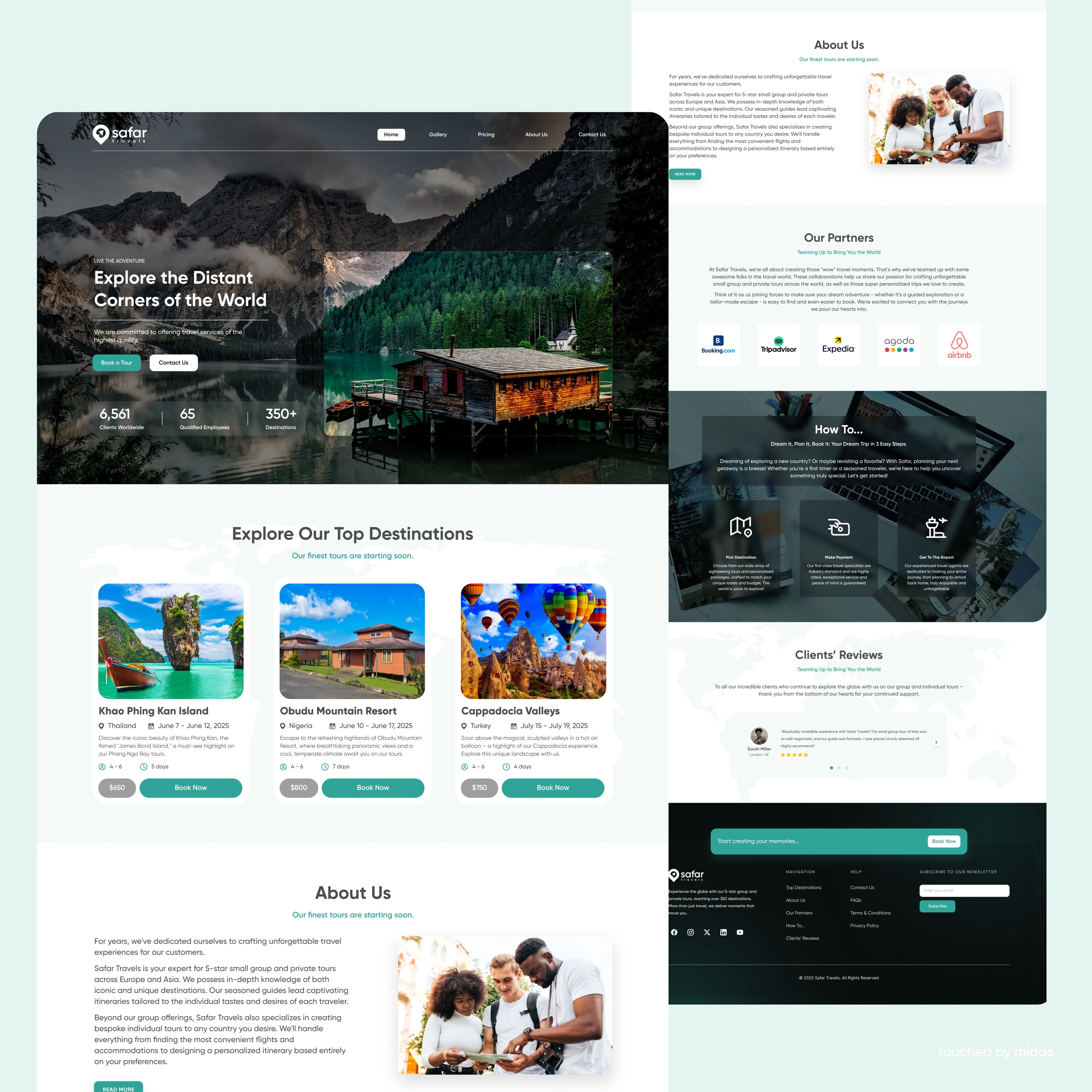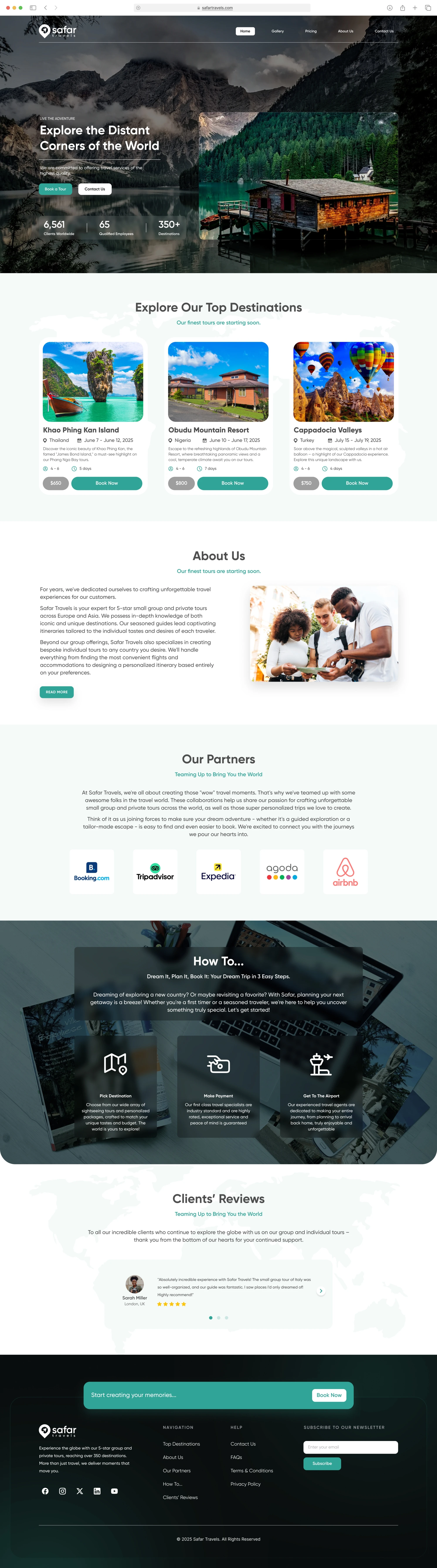 Safar Travels is a modern travel platform that offers curated group and private tours across stunning global destinations. I designed the landing page with a focus on visual storytelling, clarity, and ease of navigation to inspire trust and drive bookings.