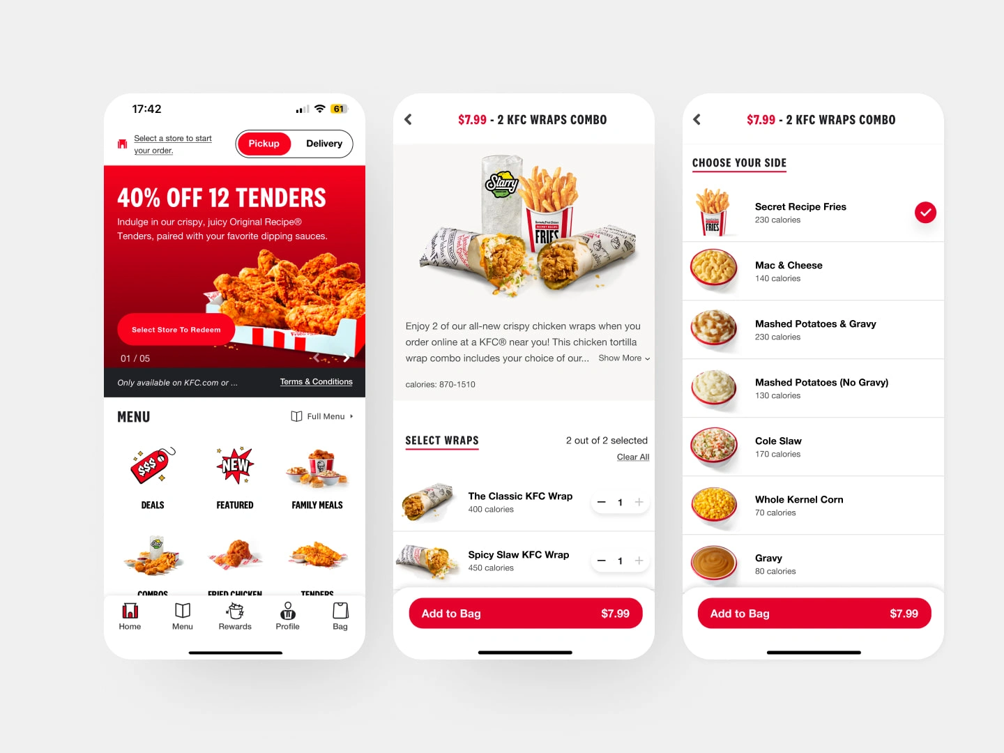 KFC's web and mobile platforms aim to streamline the customer’s ordering journey, letting them bypass in-store waits with online pick-up or delivery orders. Tasked with enhancing this user experience, I delved into a complex design challenge: Simplifying the Product Detail Page (PDP), with a focus on multiple sides selection.