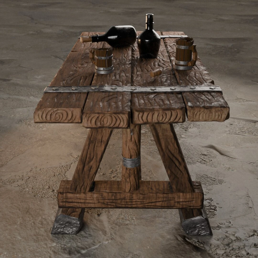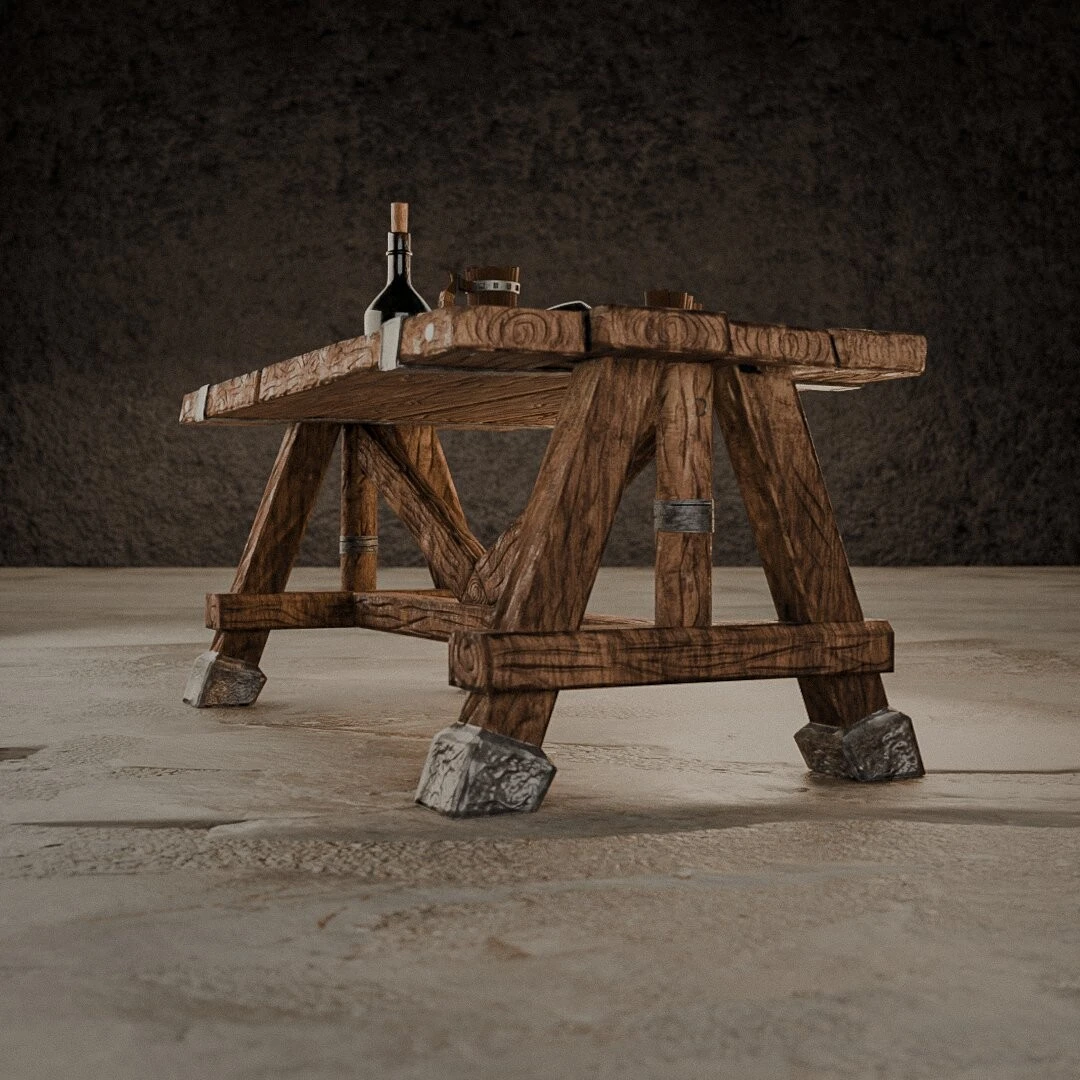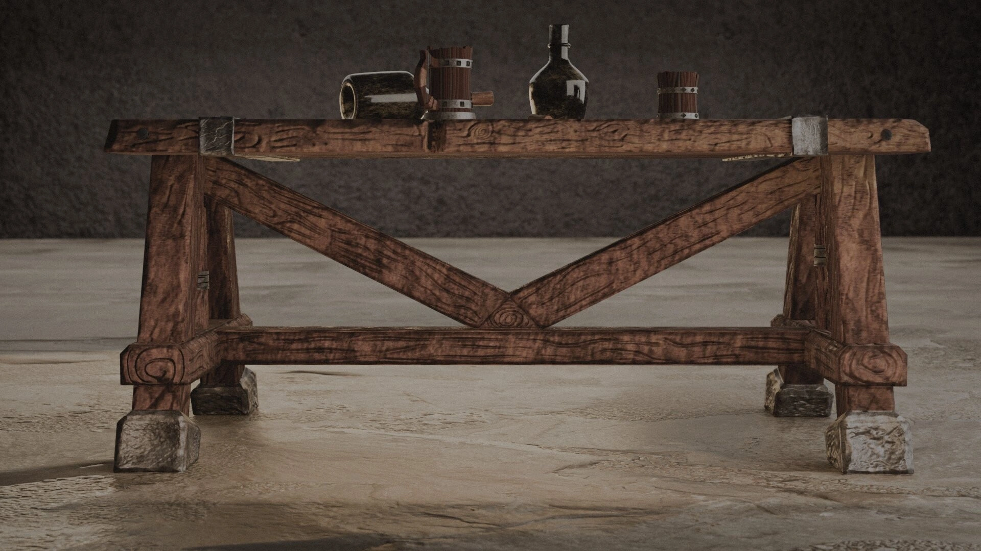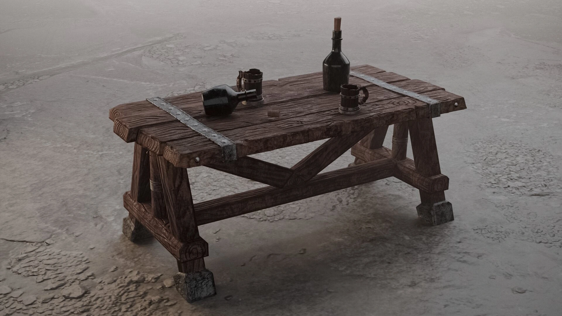 The details of the table legs and brackets were sculpted and baked using Blender, then optimized into relatively low-poly models totaling 95,000 faces whereas high-poly version consisted of more than a 21 million faces. Artifacts on the normal map were corrected in Photoshop, alongside the final color adjustments for the renders.