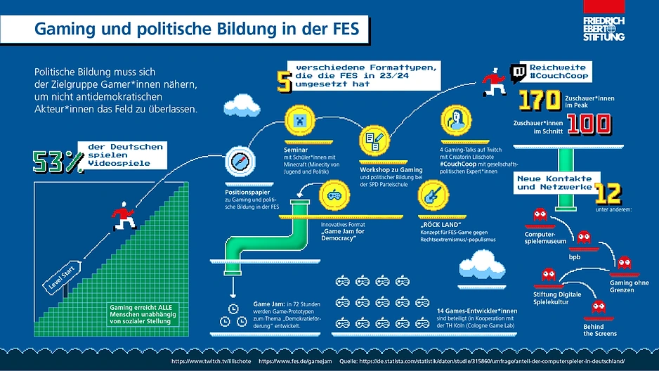 Infografik Pro created an infographic on the topic of political education and gaming for the Friedrich Ebert Foundation. The goal: Political education must take on the challenge of approaching the target group of gamers in a barrier-free manner in order not to leave the field to anti-democratic actors. It must be available on the platforms where gamers are (Discord, Twitch, TikTok) and provide long-term information about anti-democratic codes and the socio-political power of games.