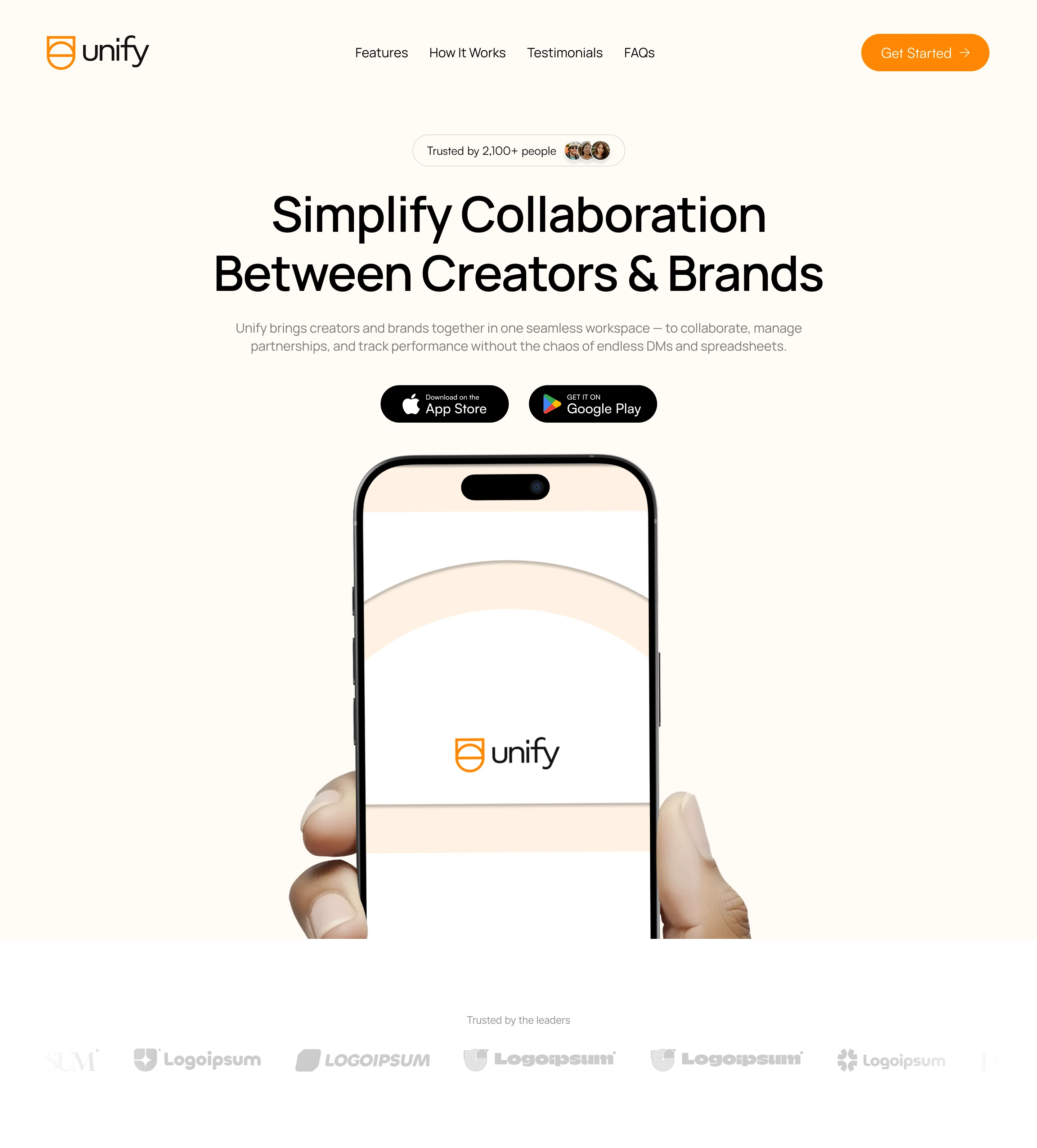 Designed a modern, social landing page for Unify, a SaaS platform connecting creators and brands.