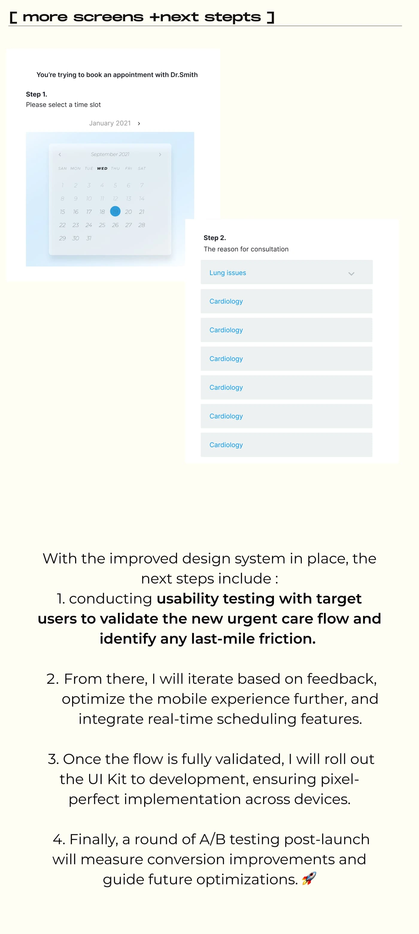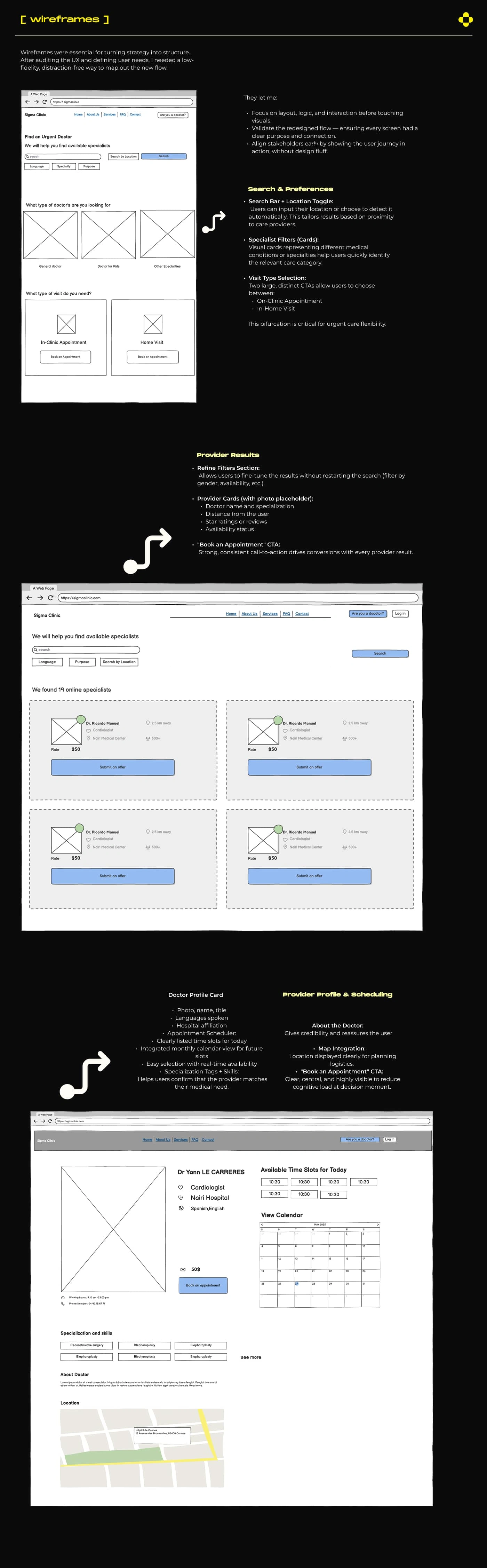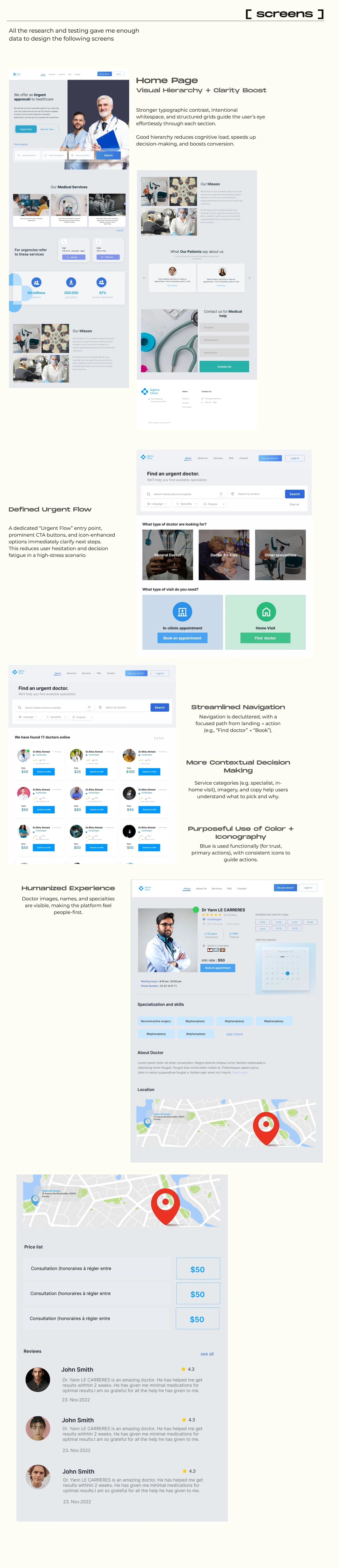 The client provided six disconnected screens, each attempting to serve a different function — from doctor profiles to appointment booking. However, no clear user flow existed between them. The experience felt scattered and inconsistent, lacking a unified structure or narrative. Instead of a seamless journey, users were forced to jump between loosely connected pages, leading to confusion, friction, and drop-offs.
