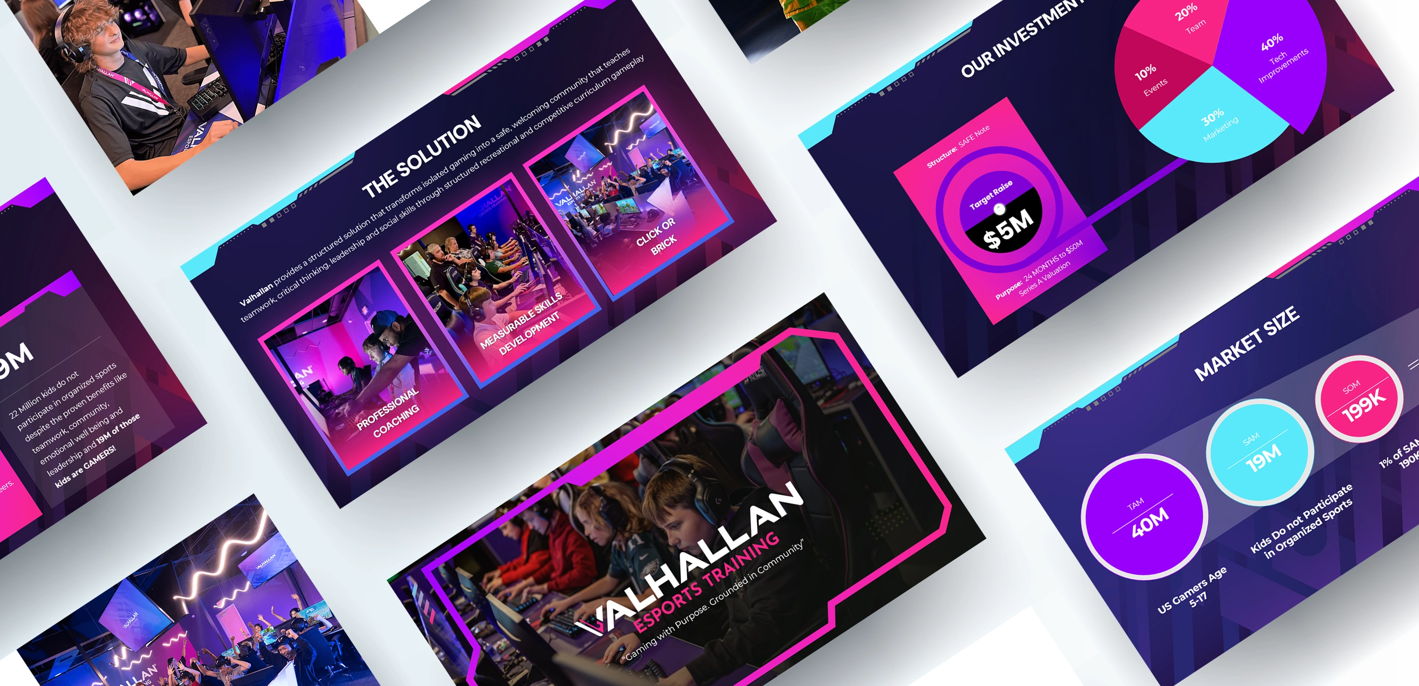 For Valhallan, a next-generation esports training and development platform, I designed a strategic pitch deck and professional presentation that communicates the brand’s purpose, scalability, and impact within the gaming ecosystem. The goal was to create an investor-focused presentation design that clearly explains how Valhallan converts gaming into a structured, educational, and community-driven experience that develops leadership, teamwork, and critical thinking skills.