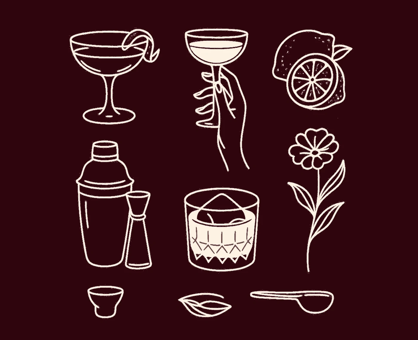 The visual identity combines a rich palette of deep tones, premium serif typography, and an exclusive set of line art illustrations that reinforce the brand's artisanal language.