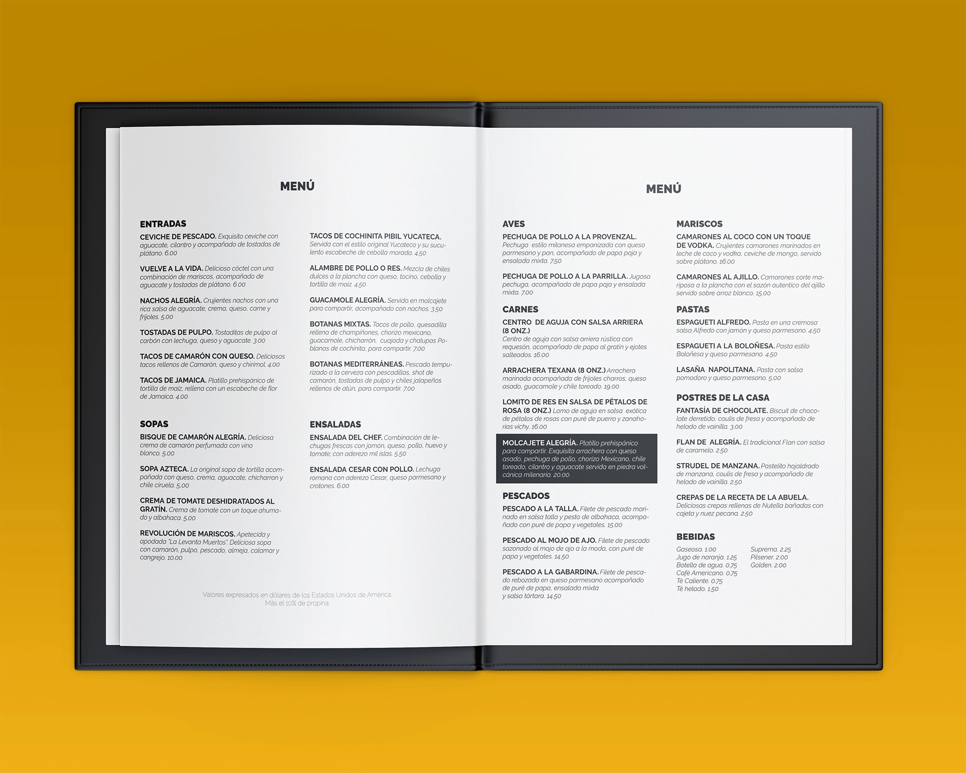 For this upscale Mexican restaurant, I developed a menu design that emphasizes both sophistication and simplicity, crafted to engage a high-end clientele. The design combines clean visuals, understated colors, and carefully selected typography to create a polished aesthetic that resonates with the restaurant's refined ambiance. Every element, from the balanced spacing to the minimalistic iconography, was thoughtfully chosen to keep the menu uncluttered and easy to navigate, allowing diners to focus on the incredible culinary offerings.