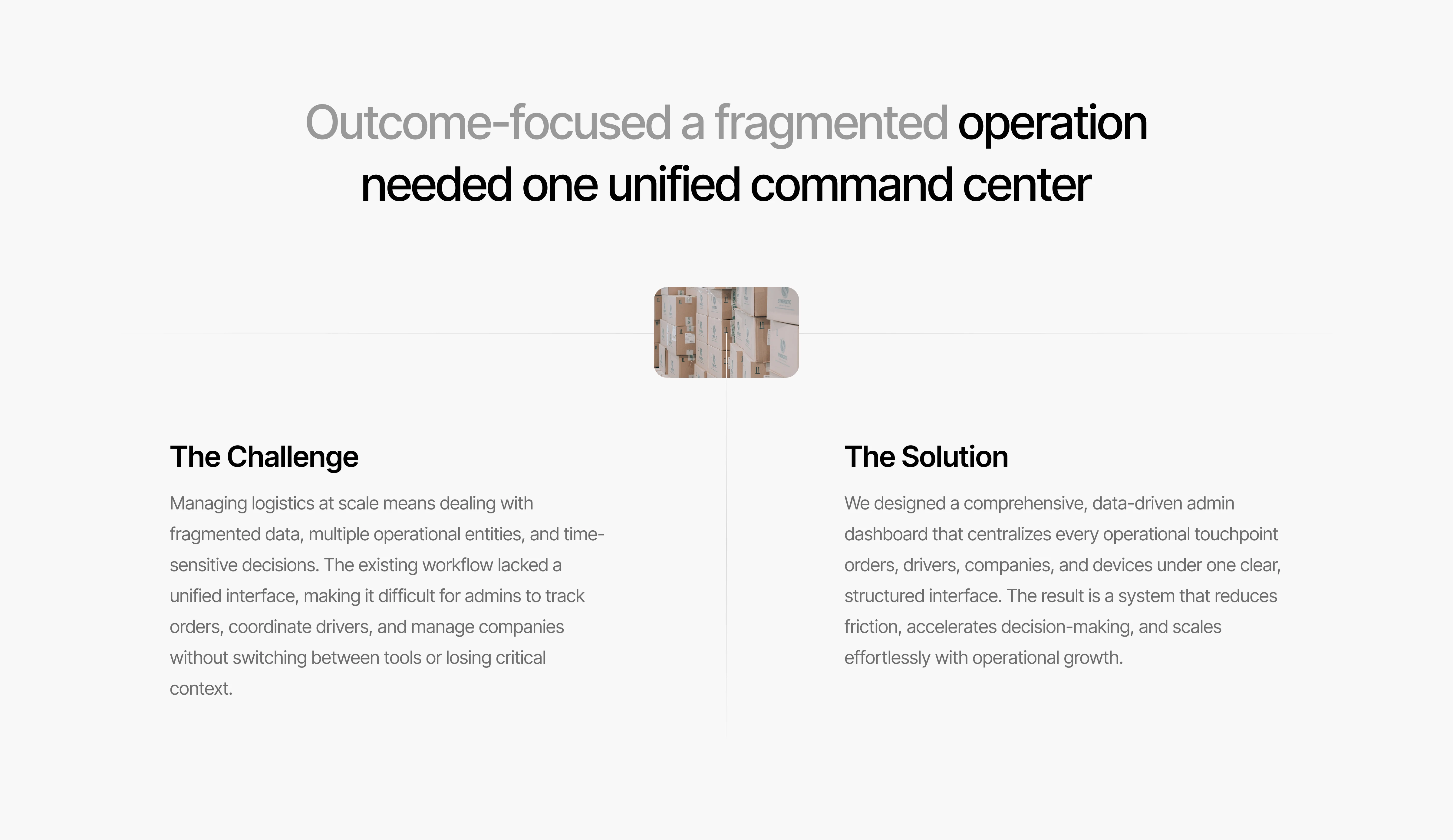 The core challenge was that managing logistics at scale meant dealing with scattered data, multiple operational entities, and time-sensitive decisions all at once. There was no single place to track orders, coordinate drivers, and manage companies together.