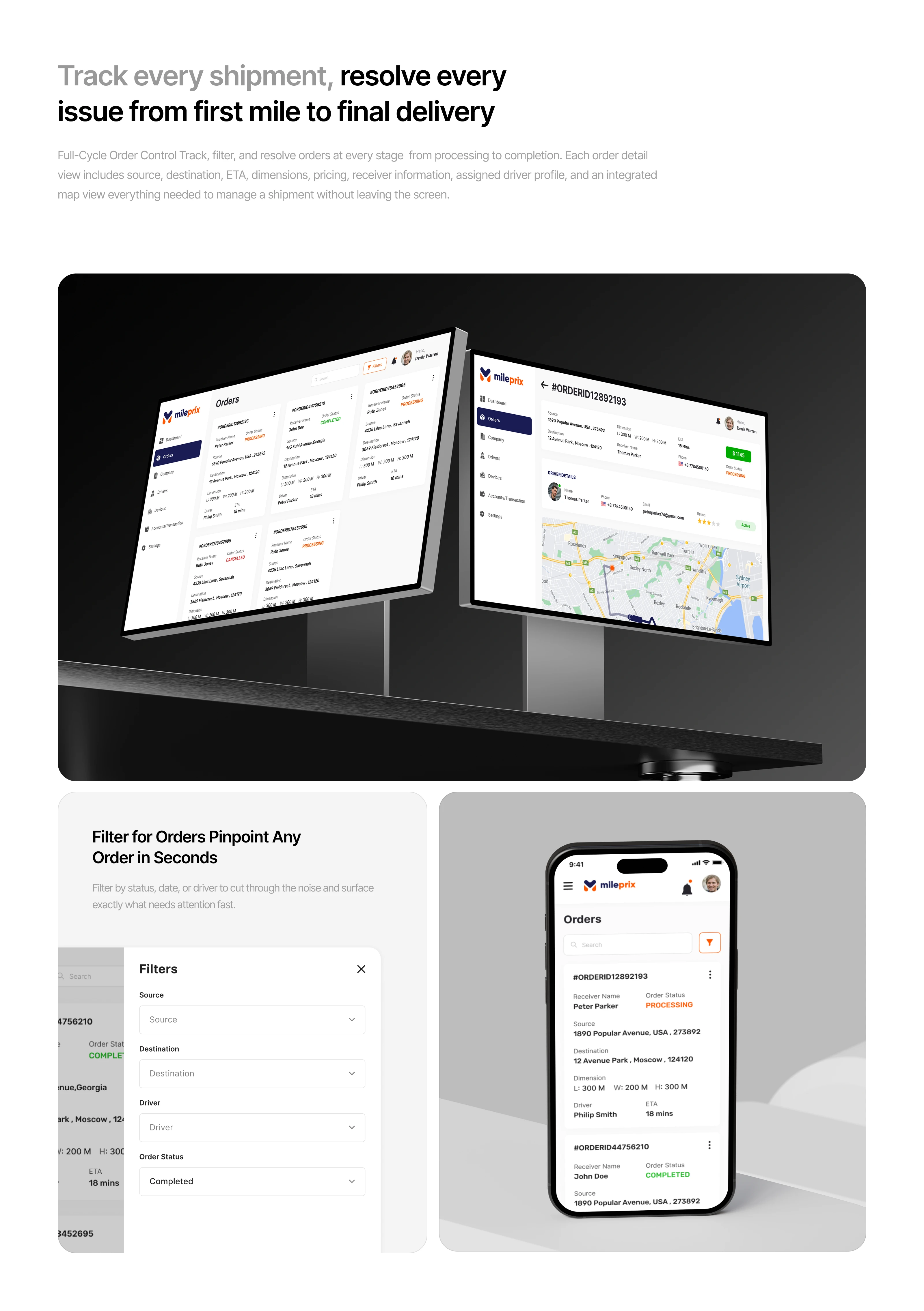 The platform offers full-cycle order control, allowing admins to track, filter, and resolve shipments at every stage from first mile to final delivery. Each order detail includes source, destination, ETA, pricing, receiver info, assigned driver, and an integrated map view.