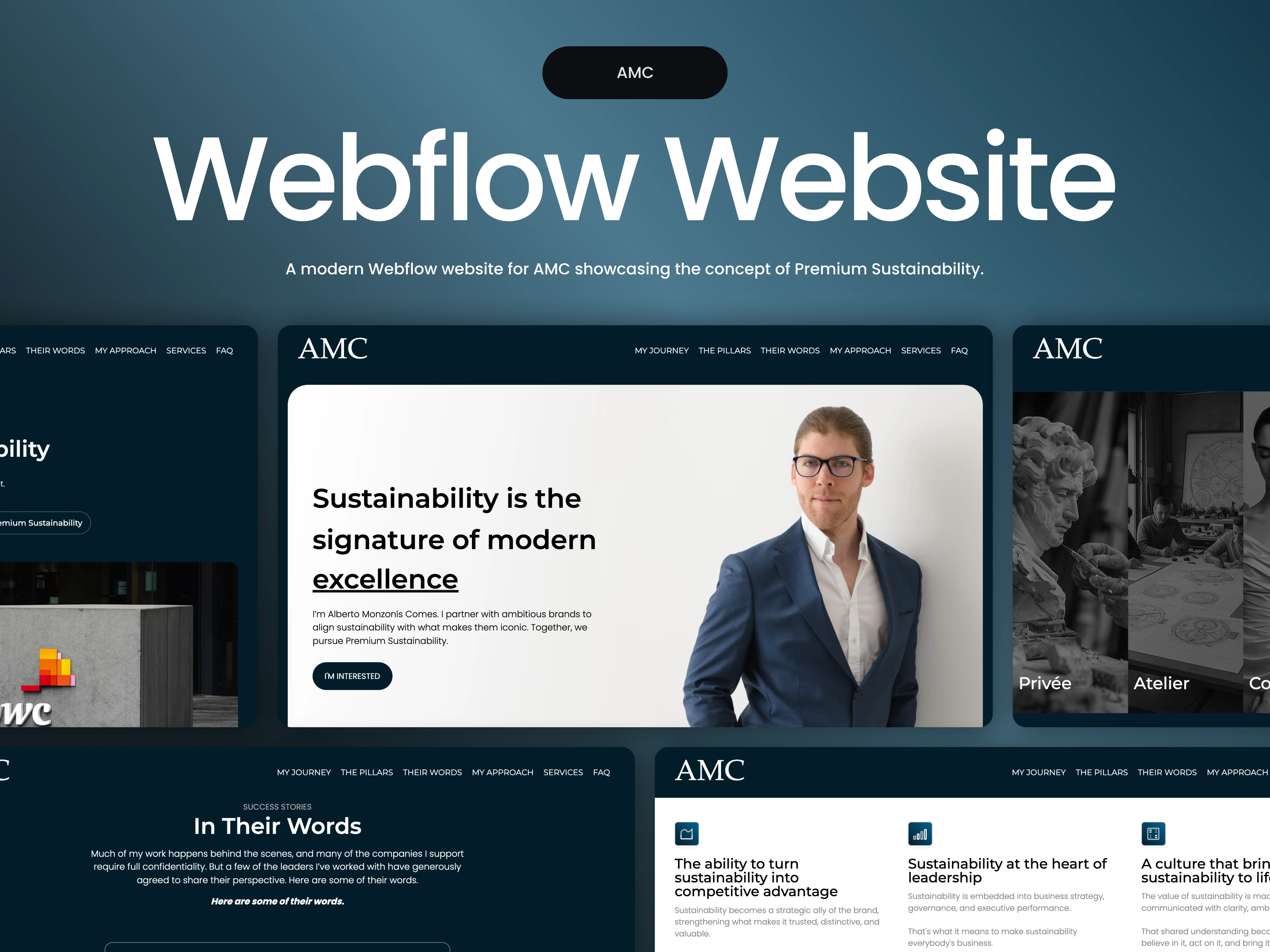 Designed and developed a modern Webflow landing page for AMC, a premium sustainability consultant. Built with scroll-based UX, clean animations, and a sleek aesthetic inspired by Apple-style branding. The site is fully responsive, SEO-optimized, and easy to edit, perfect for personal branding and high-end service promotion.
