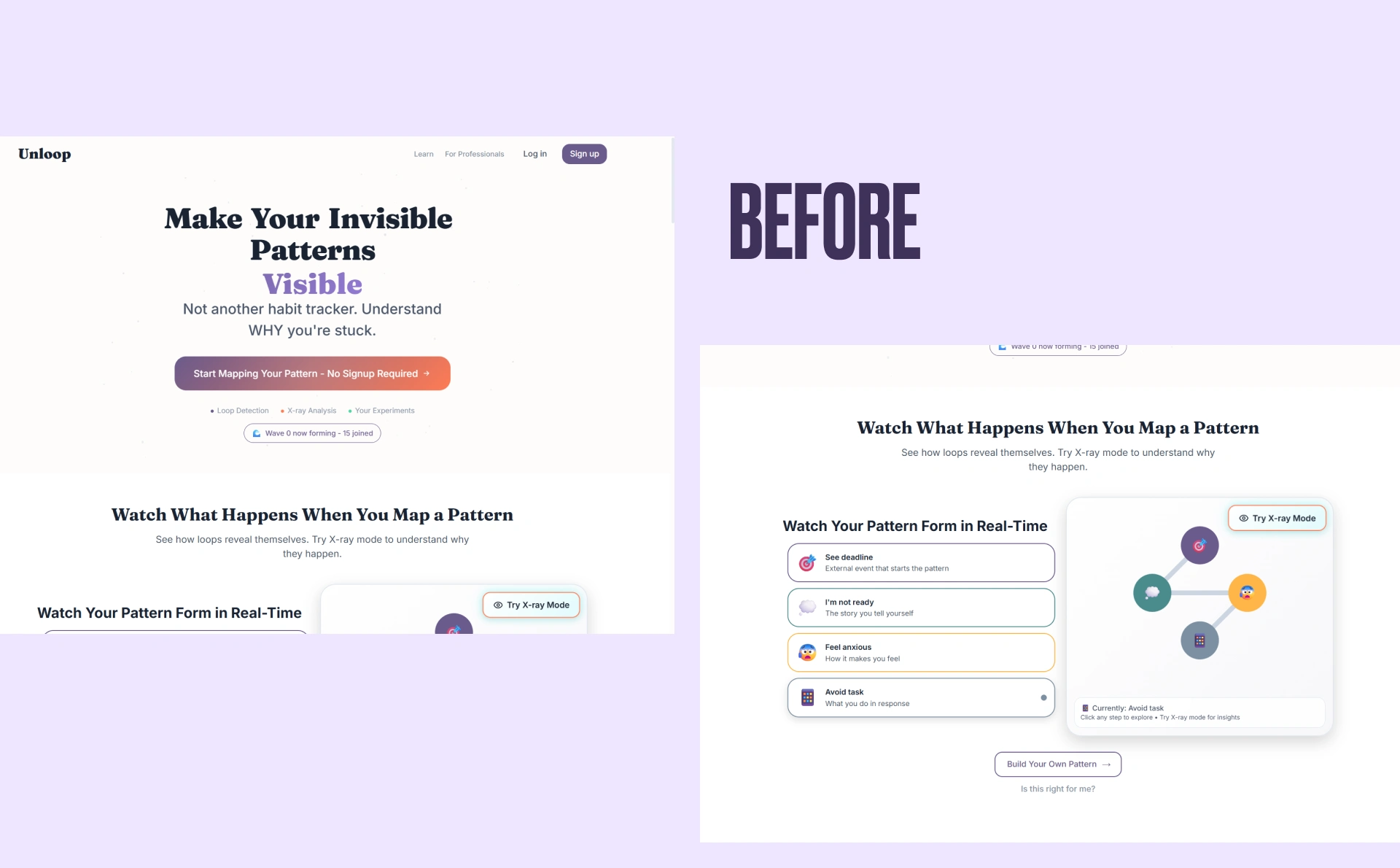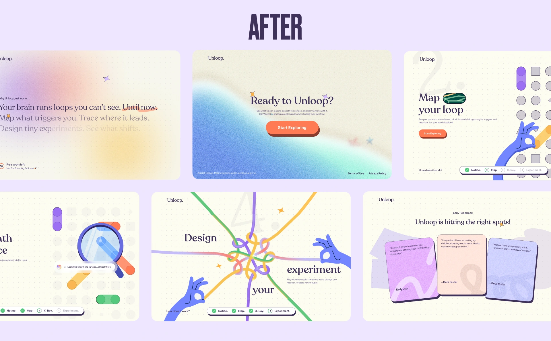 Unloop is a self-guided visual tool for people who feel stuck in repeating behaviours. The hard part wasn’t building features. It was getting new visitors to understand what this is before they bounced. Early users kept saying the same thing: “I didn’t get it… then I tried it, and it clicked.” The old landing page didn’t get them to that first “click”. It was heavy on terminology and light on felt experience, so the product was losing people before the first interaction.