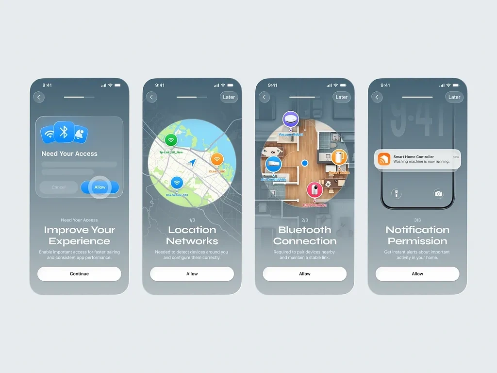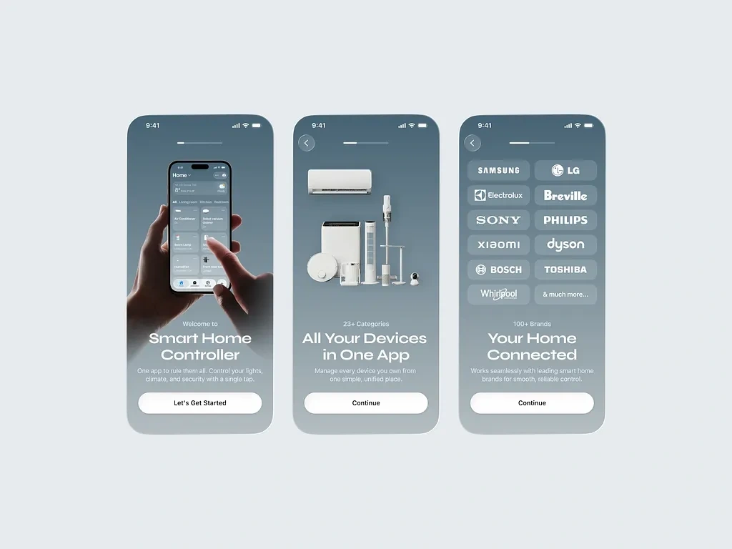 The onboarding flow introduces the app step by step, answering key questions before they arise. It shows how different devices can be managed in one place and reassures users that the app works with a wide range of brands. This gradual introduction helps reduce uncertainty and builds confidence early on.