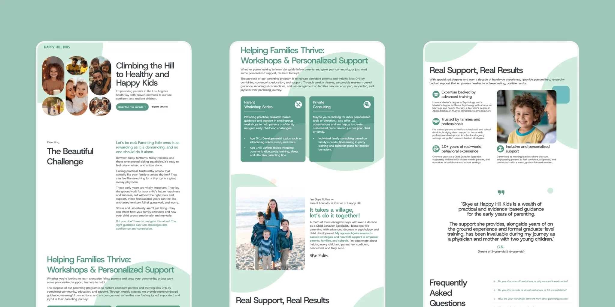 The custom one-page site was structured to immediately connect with visitors through a “hero” message about empowering parents and easing the challenges of raising toddlers. The site clearly outlined Skye’s two main service areas while weaving in her certifications and personal parenting insights as differentiators.