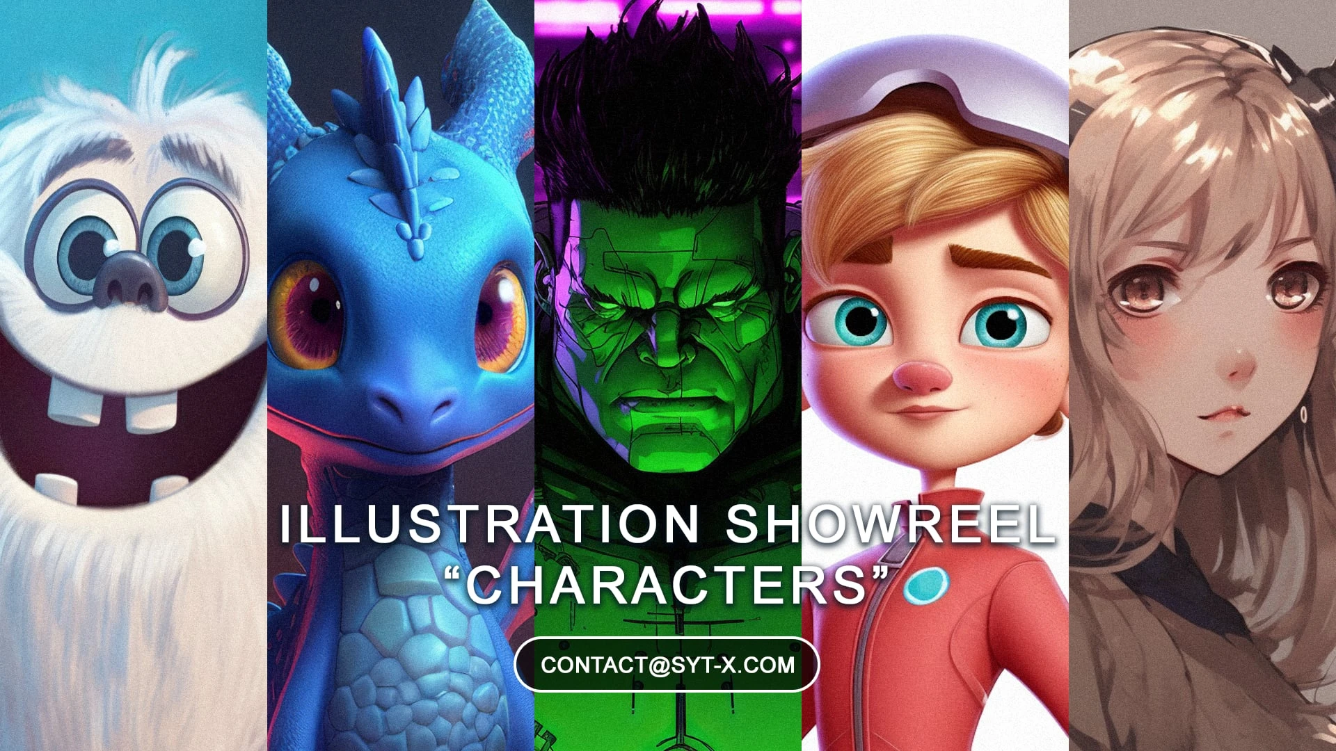 Character illustration showreel featuring 3D and 2D stylized character designs and animations.