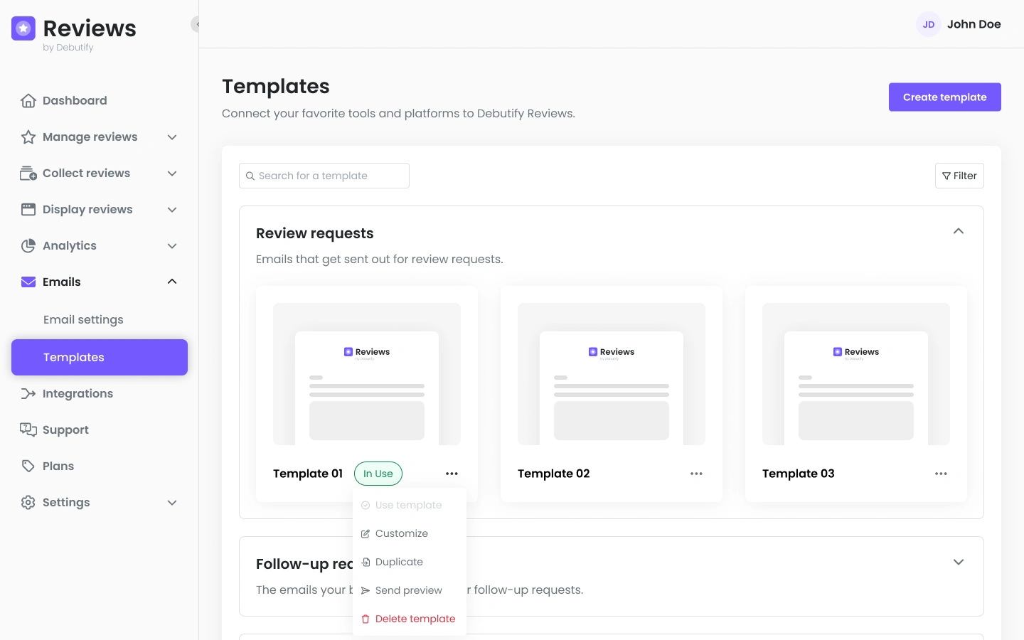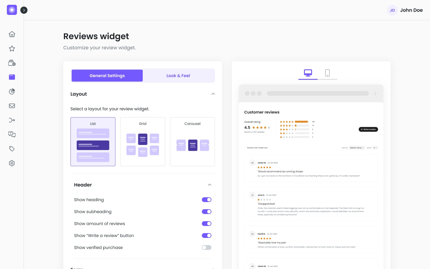 Email templates and review widgets can be customized to match a store’s branding.