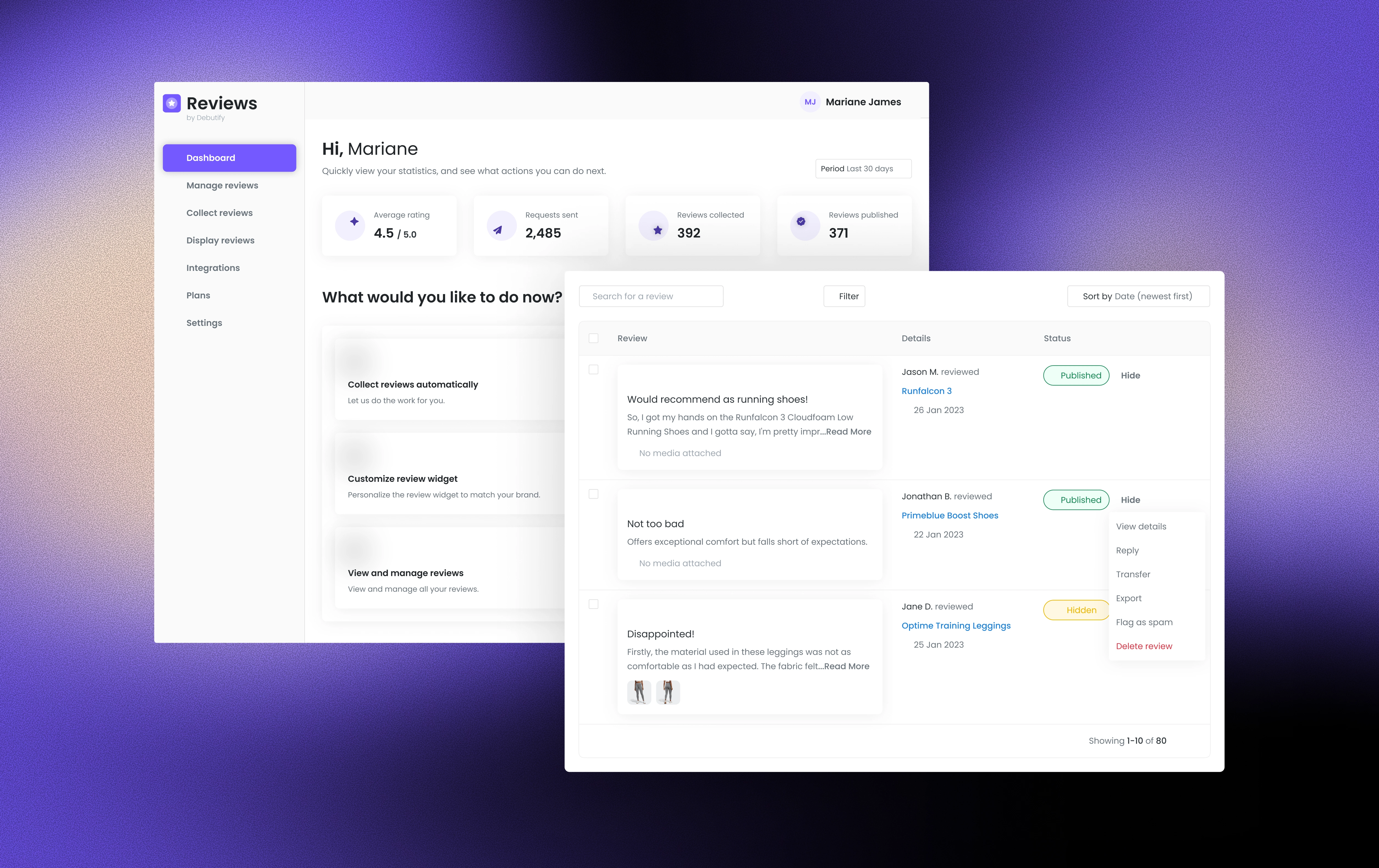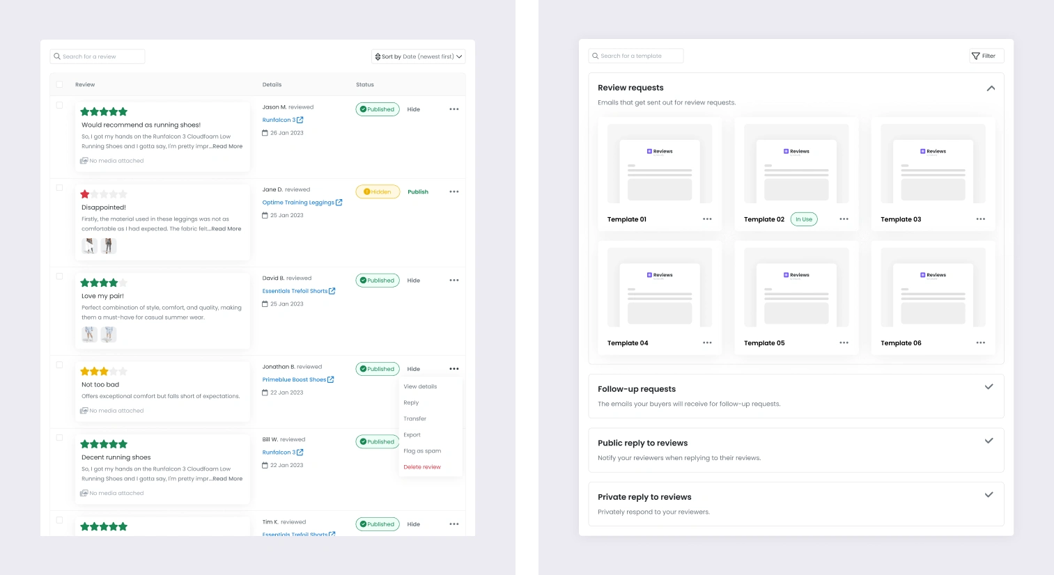 A dedicated review hub allows merchants to filter, moderate, publish, and respond to reviews in one place.