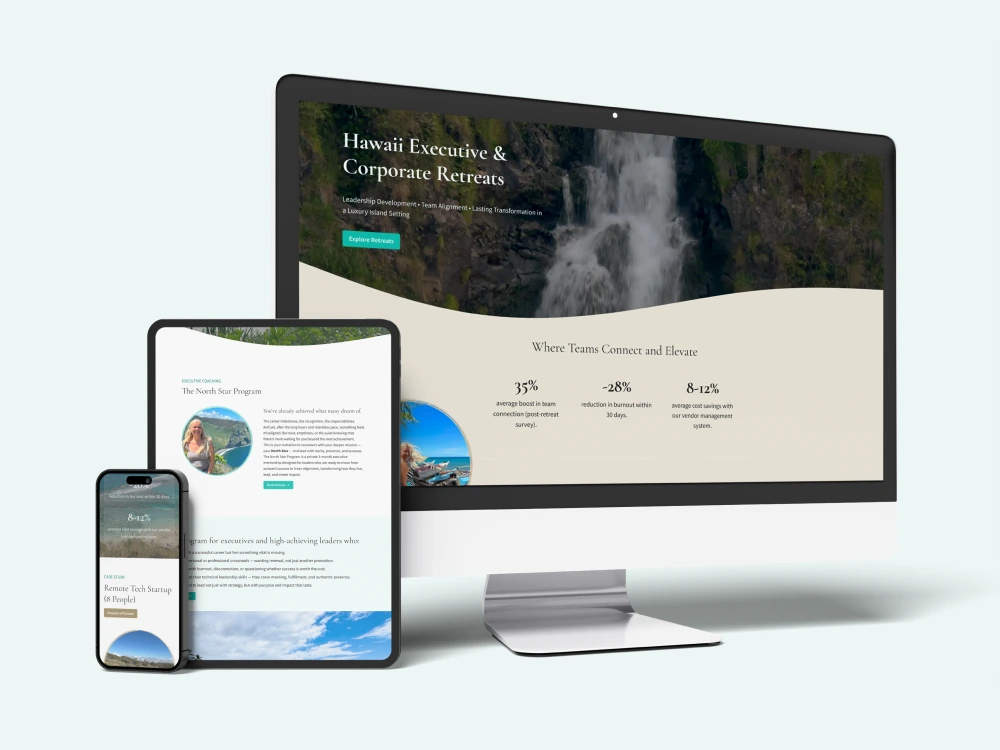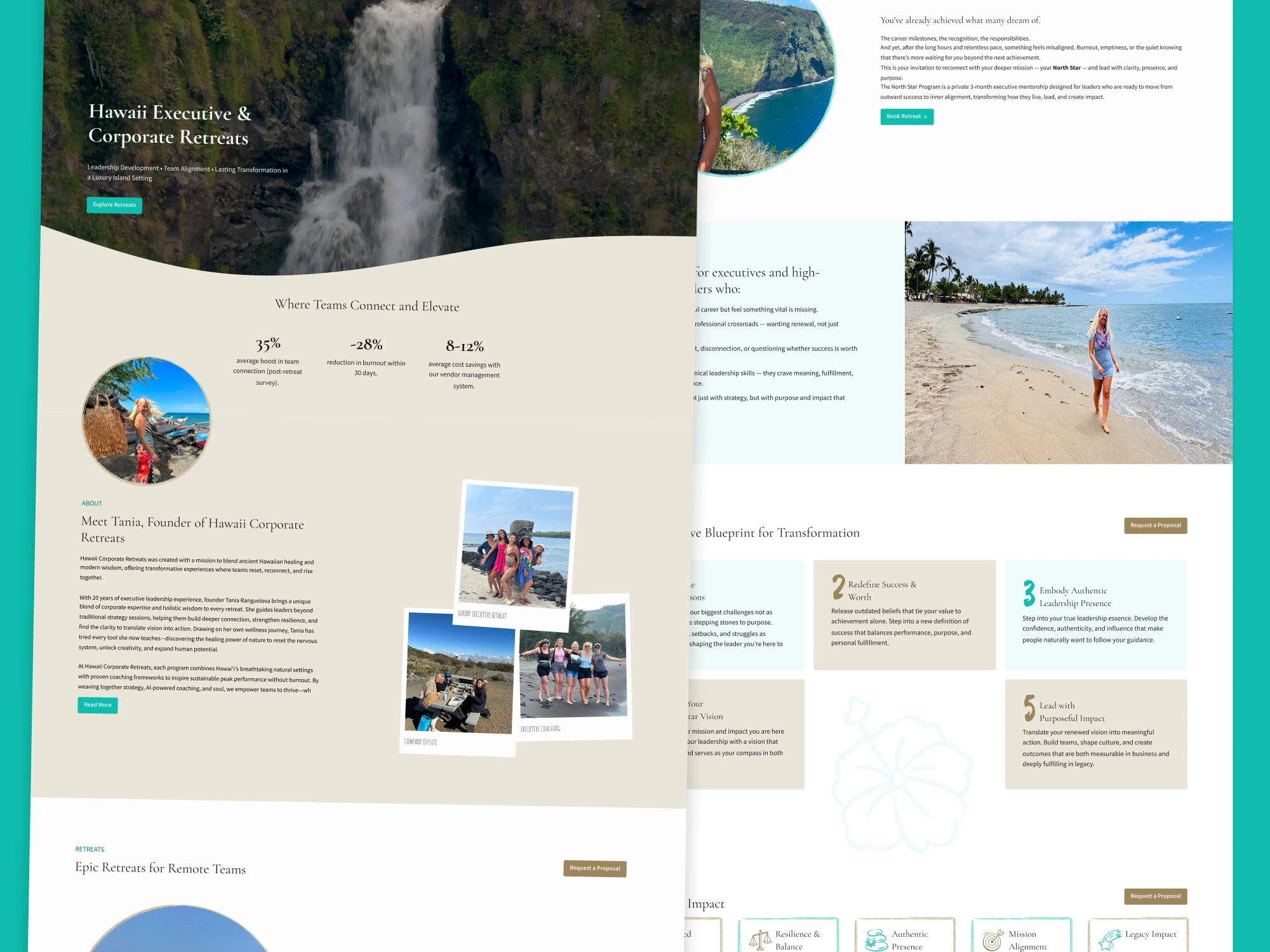 Hawaii Corporate Retreat helps companies design transformative offsite experiences in Hawaii that blend leadership growth, wellness, and team connection. The goal was to position the brand as a trusted, high-end partner and optimize the website for clarity, SEO, and conversions. I created a refined, minimal design system, structured storytelling, and SEO-ready content—resulting in stronger brand differentiation, credibility, and visibility in the corporate retreat space.