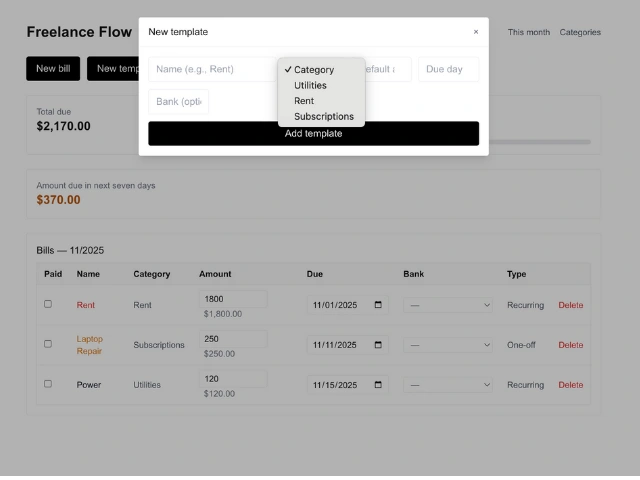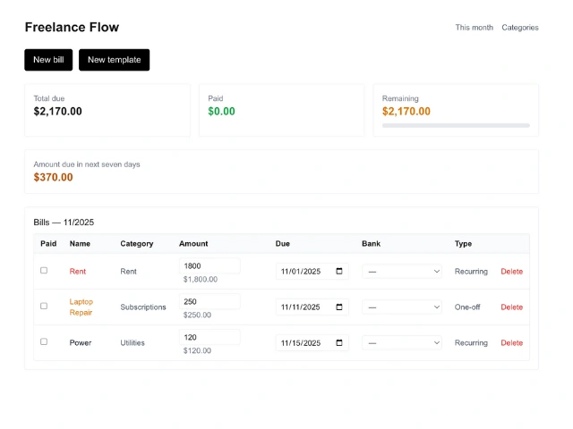 This is Freelance Flow, a lightweight finance tracker. There are a lot of budgeting tools out there, but most of them overcomplicate something pretty simple. As someone who’s self-employed, I just needed an easy way to track bills, subscriptions, which account they’re paid from, and, honestly, whether I’ve actually paid them yet. (Sometimes I space out, sue me.) It’s also important for me to know whats a ‘house bill’ versus a ‘business subscription’ and all the expenses in between.