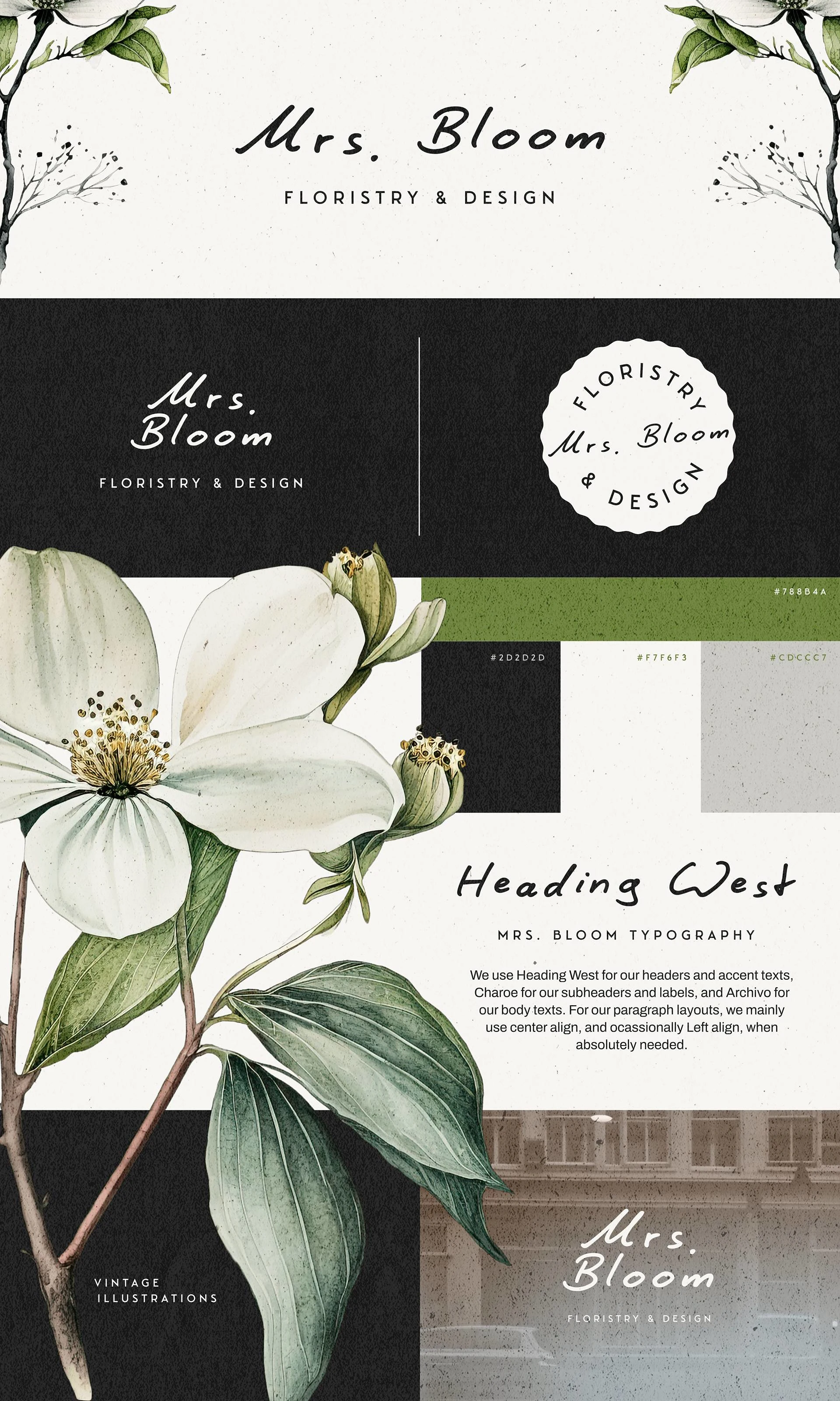 An easy to edit, minimalist brandboard for a floristry and design shop featuring a handwritten script typography and a simple geometric sans serif for supportin
