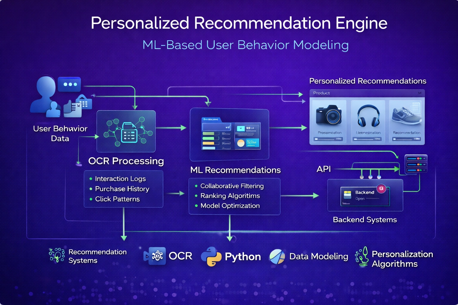 Developed a recommendation engine using collaborative filtering and user behavior analysis to generate personalized suggestions. Processed interaction data, built similarity models, and optimized ranking algorithms. Integrated model output into backend systems for real-time recommendations and improved user engagement.