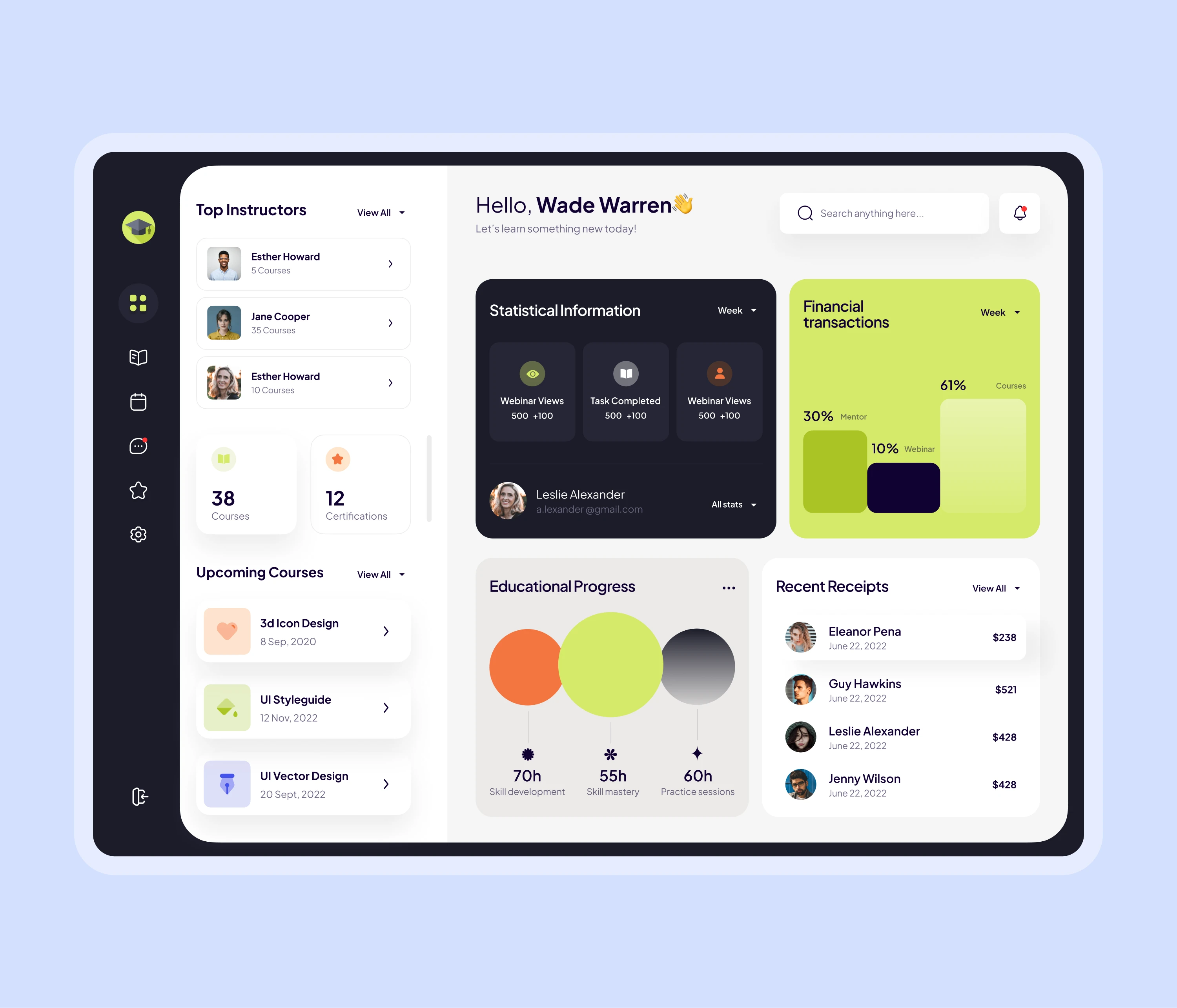 I designed a clean, insight-driven education dashboard experience that helps learners and instructors track progress, activity, and outcomes with clarity.