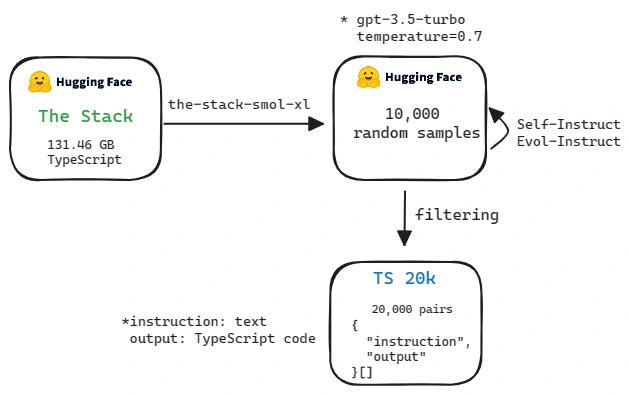 For the output, thank you HuggingFace, I get TypeScript code data from The Stack project