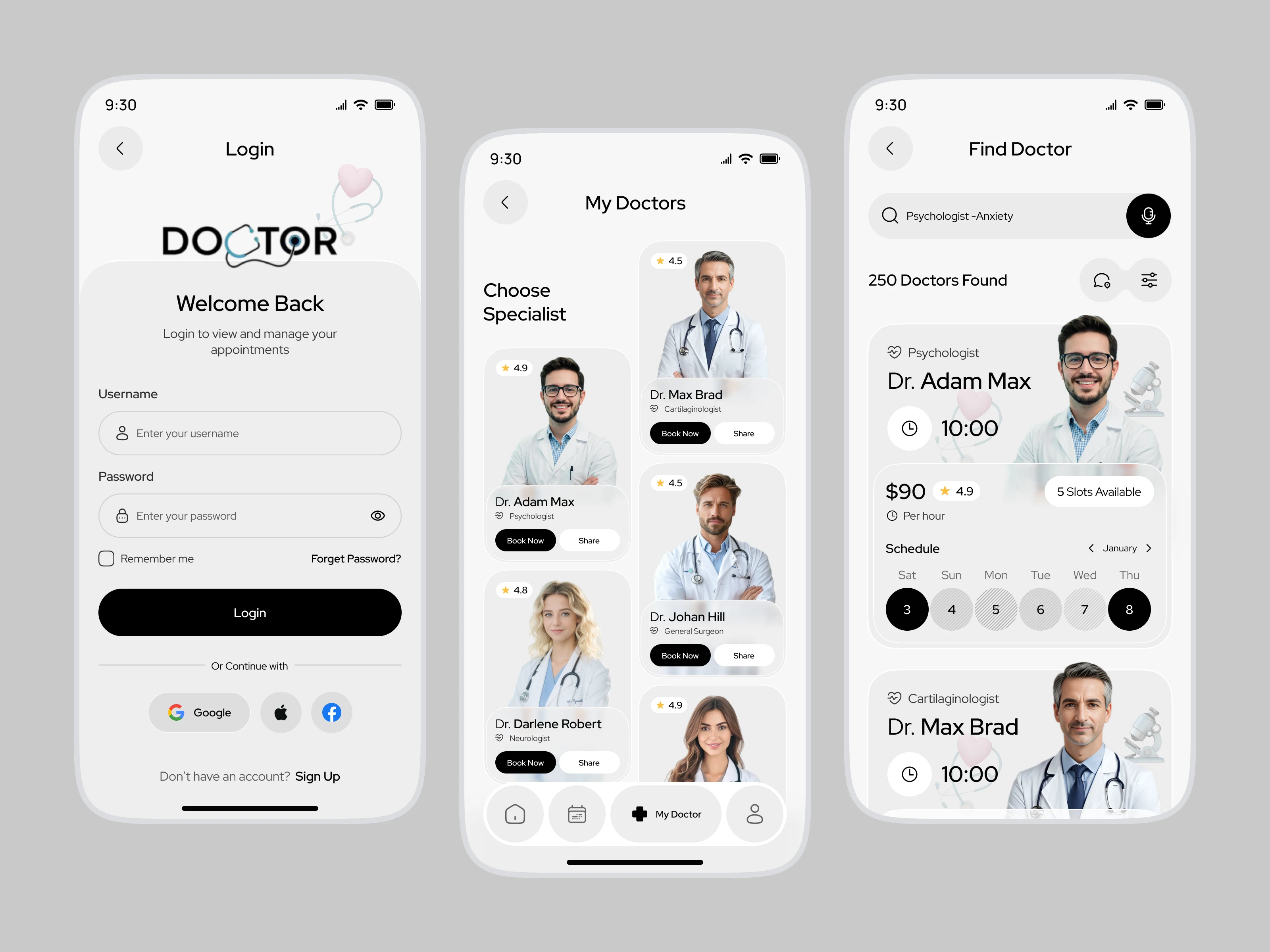 A clean and modern healthcare mobile app designed to make booking doctor appointments simple and stress-free. Users can easily find specialists, view doctor profiles, check availability, and schedule appointments with just a few taps. The interface focuses on clarity, trust, and usability with soft visuals, minimal layouts, and intuitive navigation—perfect for telemedicine platforms, clinic management systems, and health-tech startups.