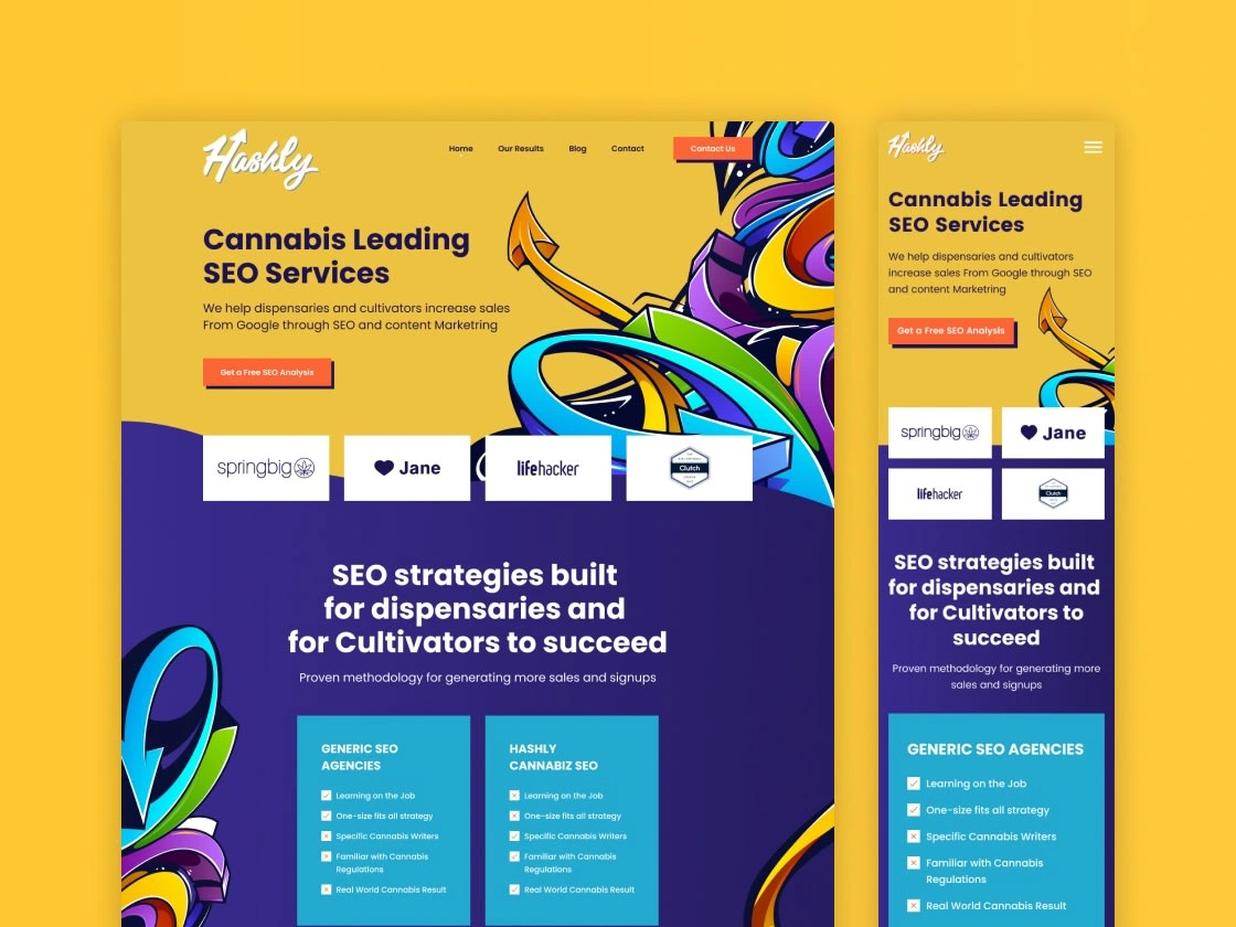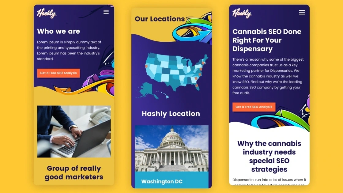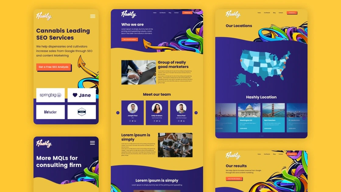 For Hashly, a cannabis industry leader specializing in SEO and content marketing for dispensaries and cultivators, I designed a modern, conversion-focused website that communicates both authority and accessibility. The brand identity relied on a vibrant yellow and purple theme, balancing energy with professionalism to help Hashly stand out in a competitive space.