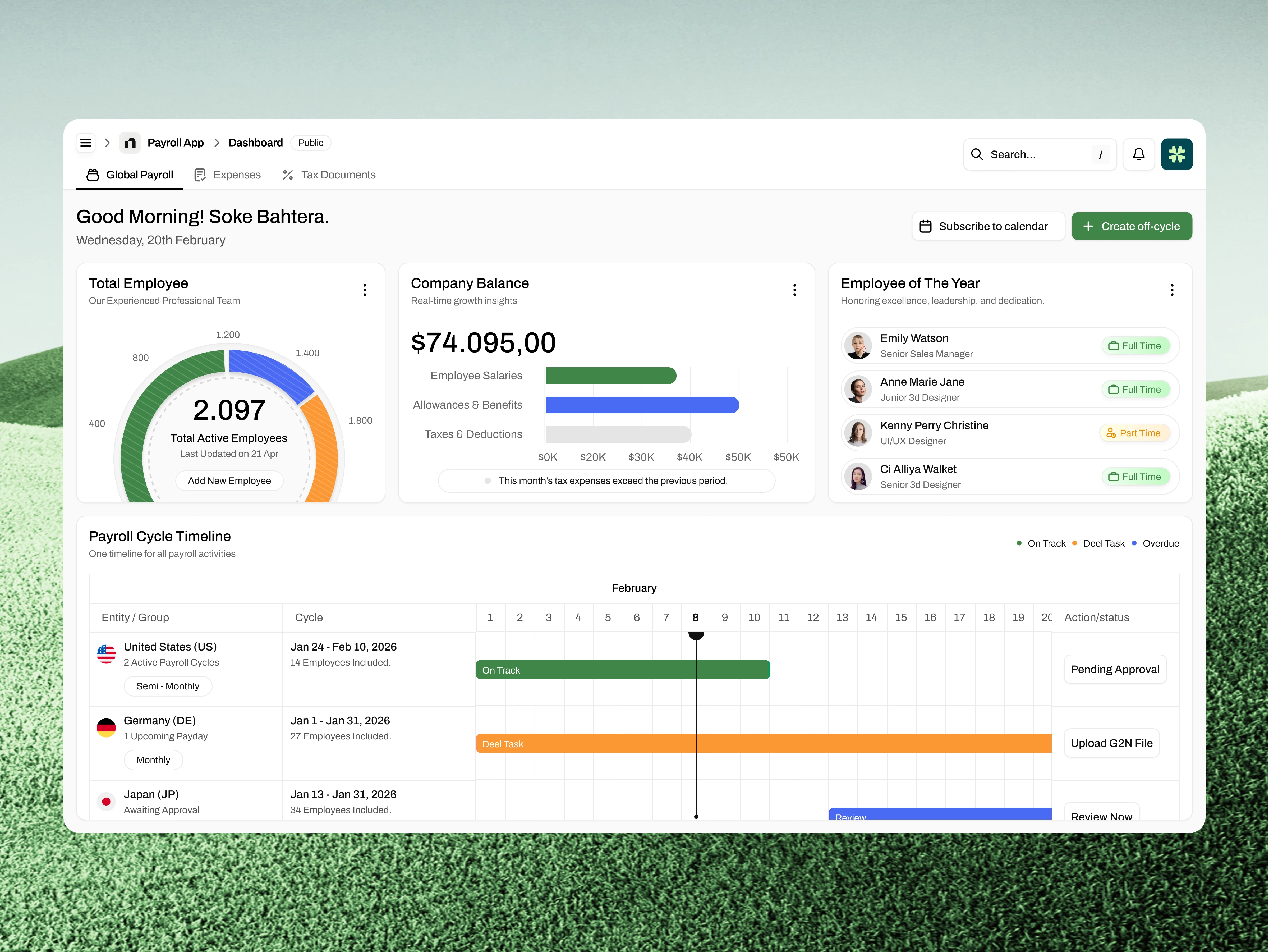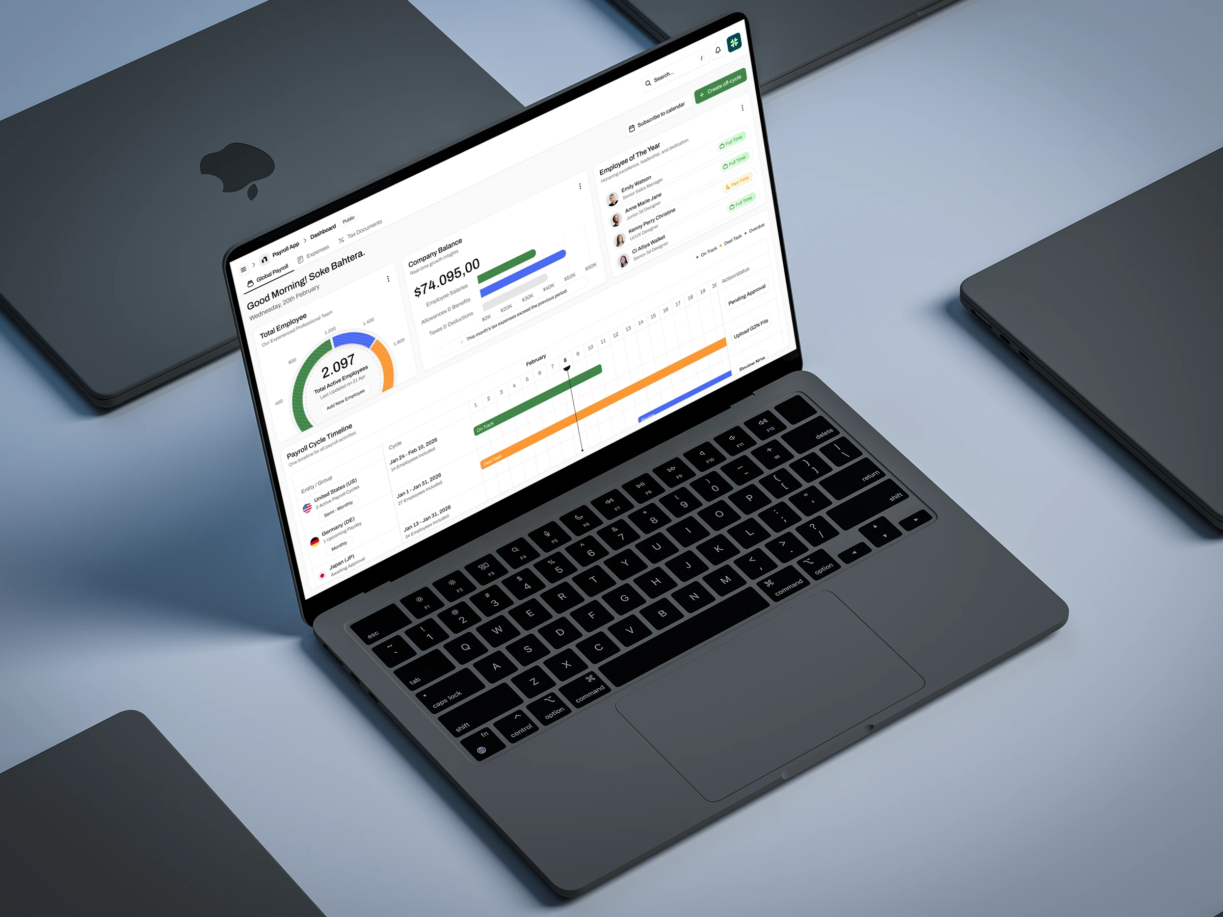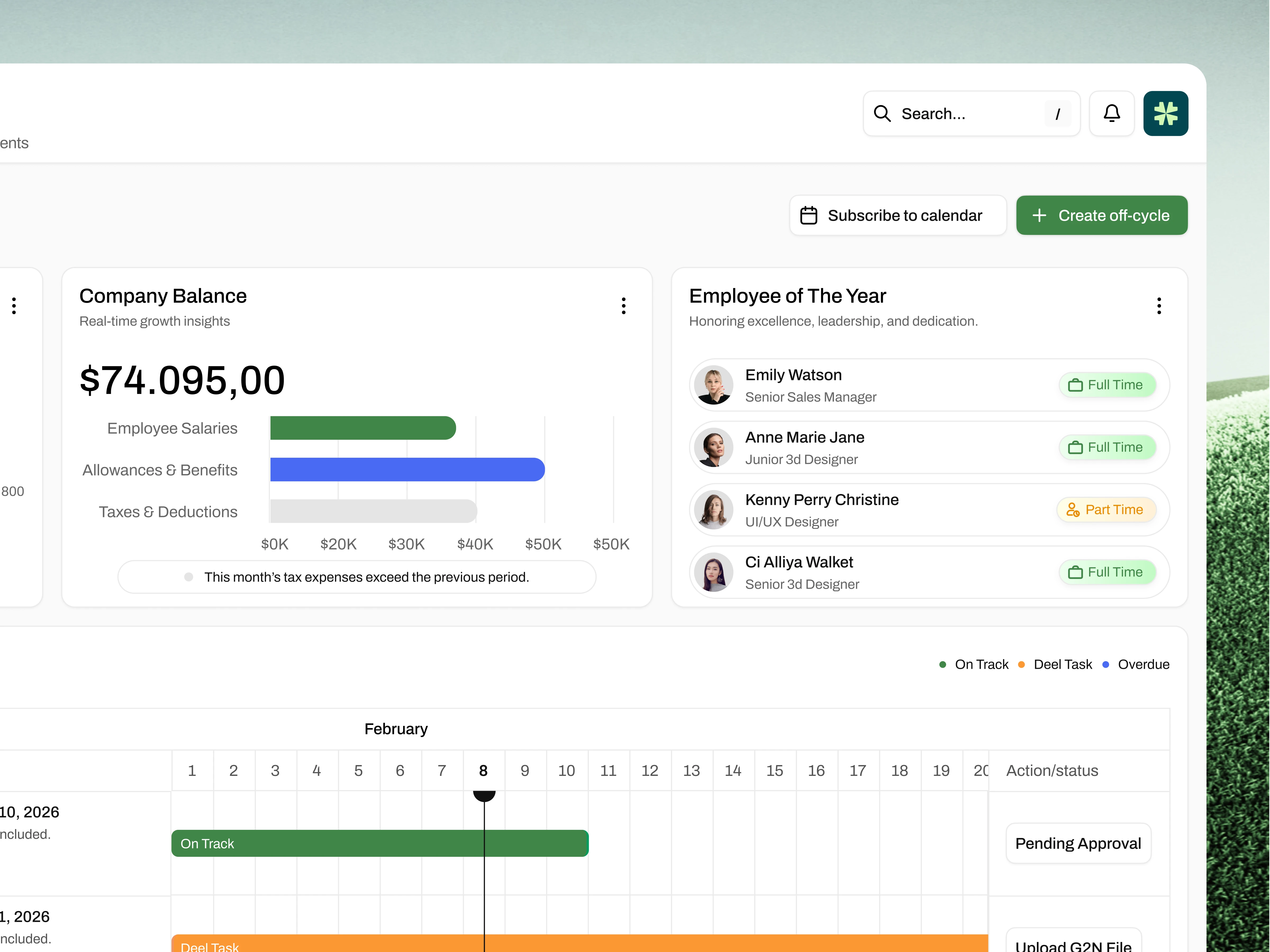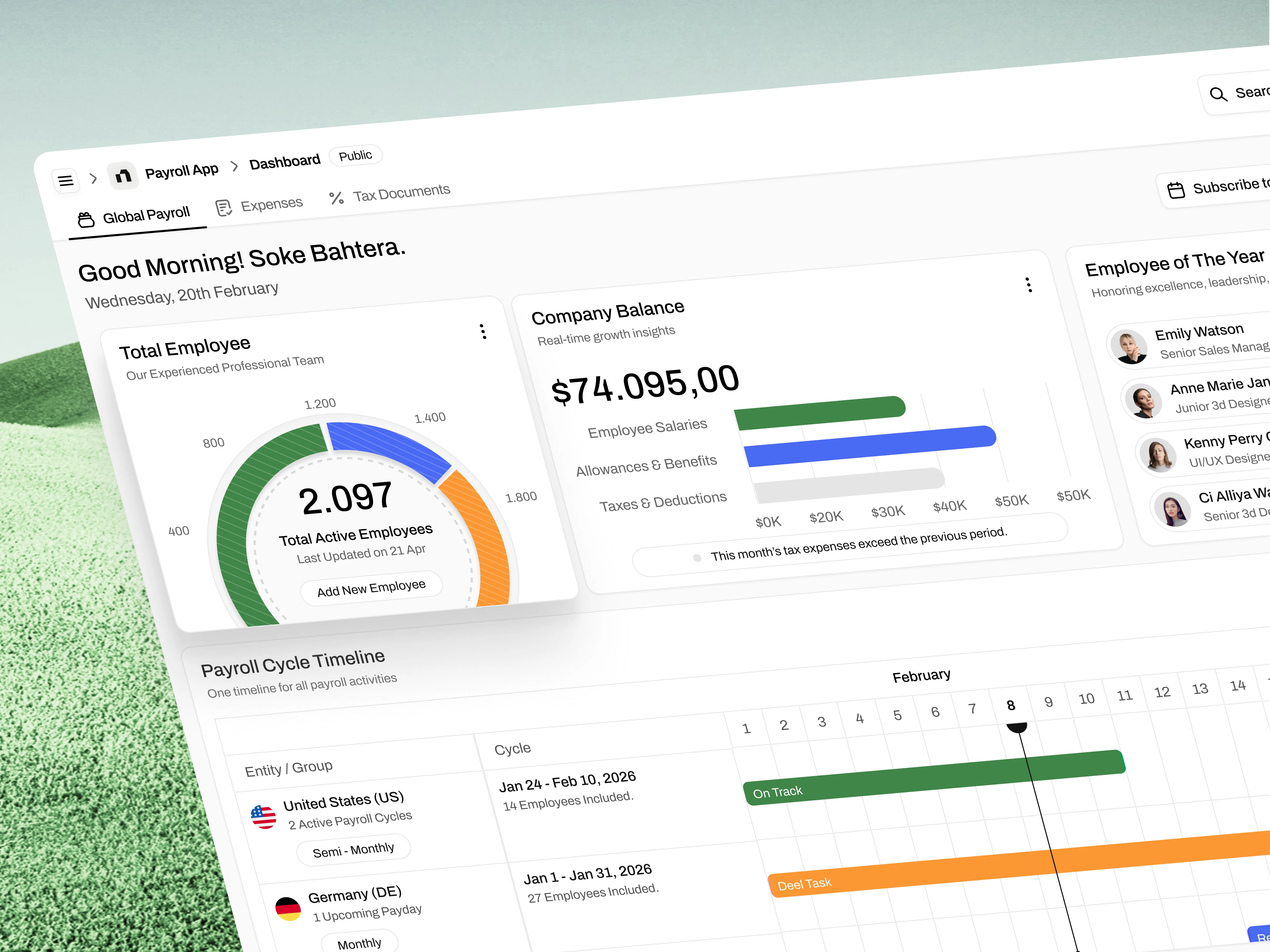 The design focuses on clarity, hierarchy, and scannability. Key information is structured into modular cards such as total employees, company balance, and employee highlights. A Gantt-style payroll timeline is introduced to visualize payroll cycles, making time-based data easier to understand. Clean spacing, soft shadows, and minimal color usage help reduce cognitive load while maintaining a professional SaaS aesthetic.
