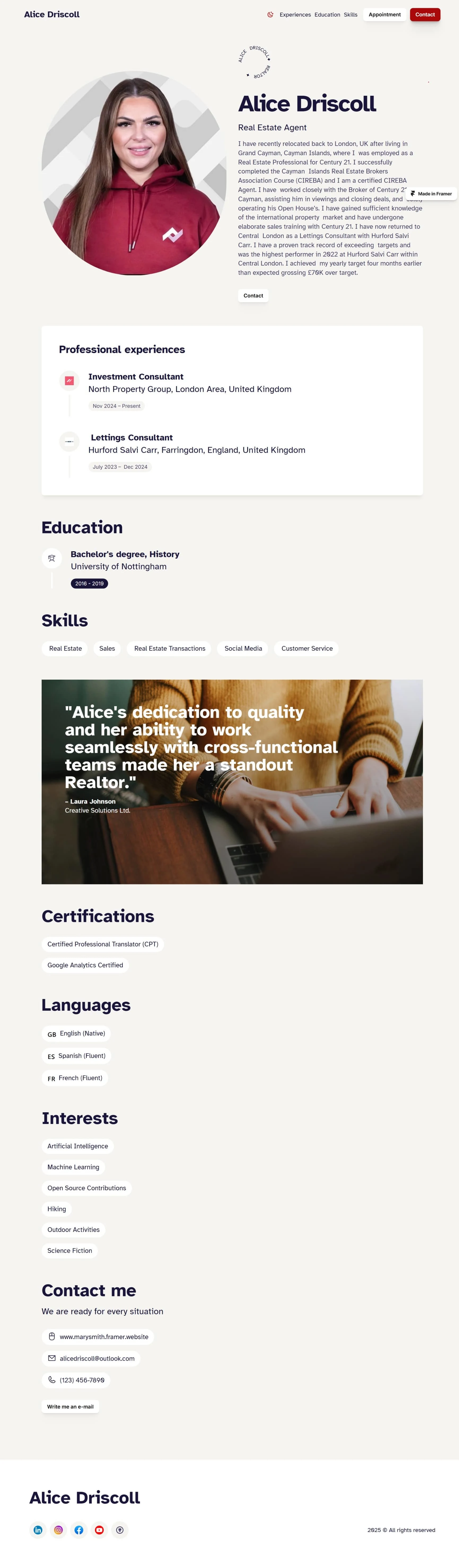 Alice Driscoll came to me to design her website on framer. I have completed the design work within 7 days.