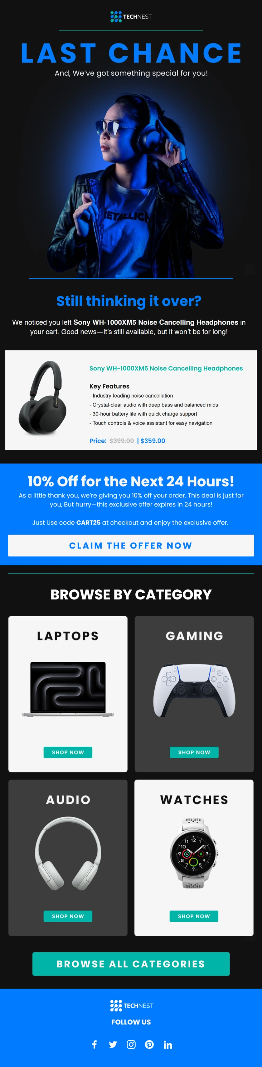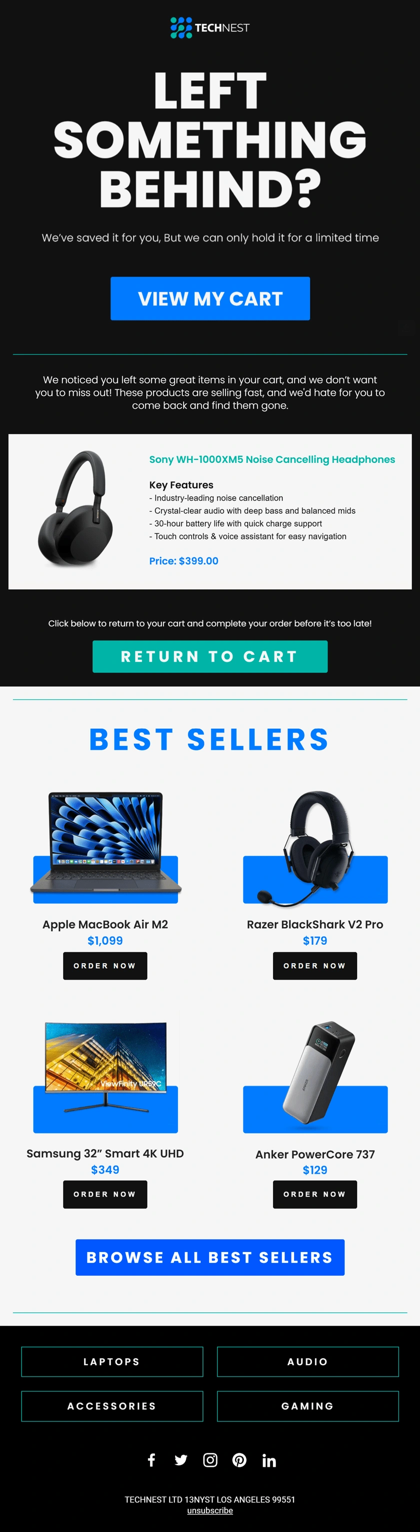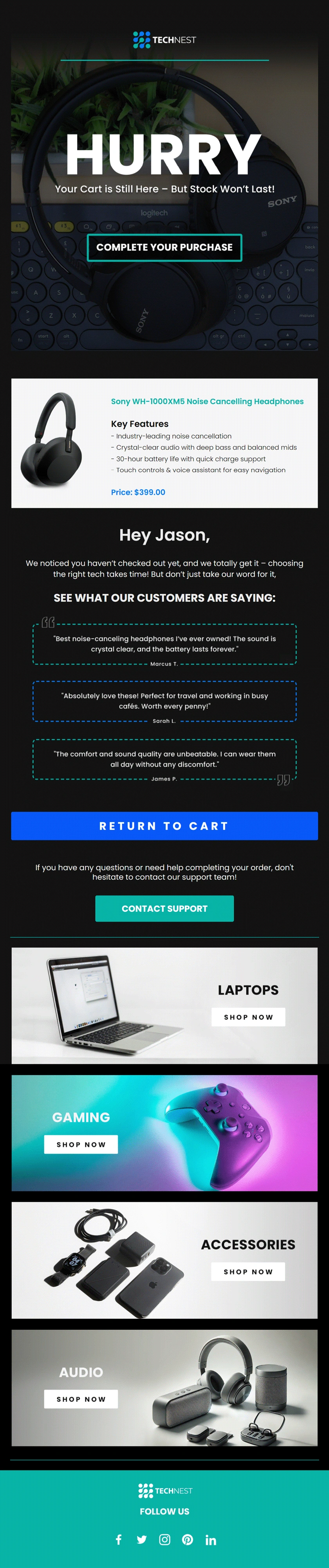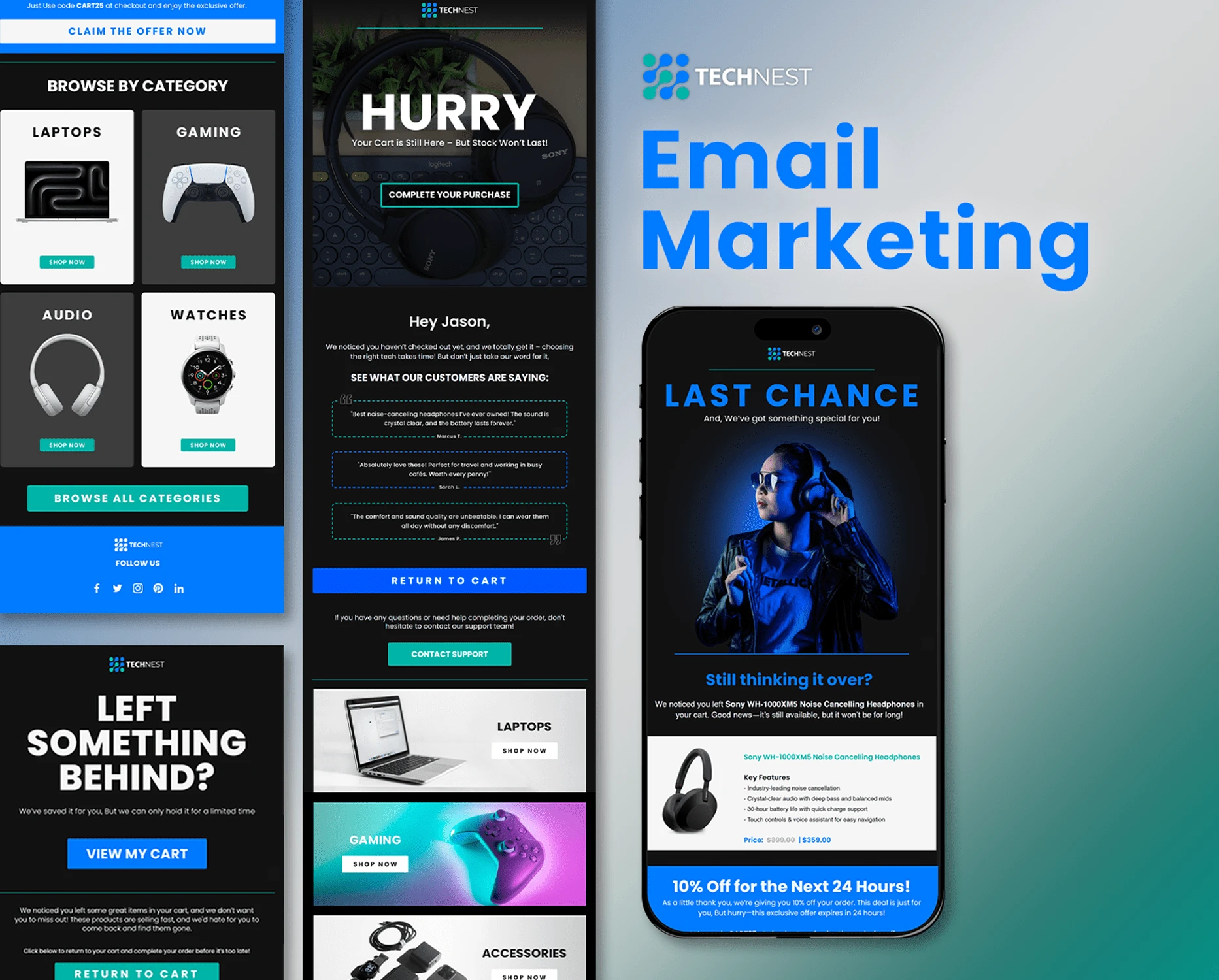 This 3-email abandoned cart series features a modern, clean design with bold CTAs, engaging visuals, and a structured layout to boost urgency, trust, and sales.