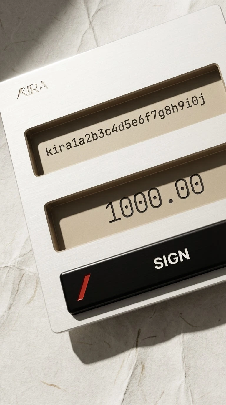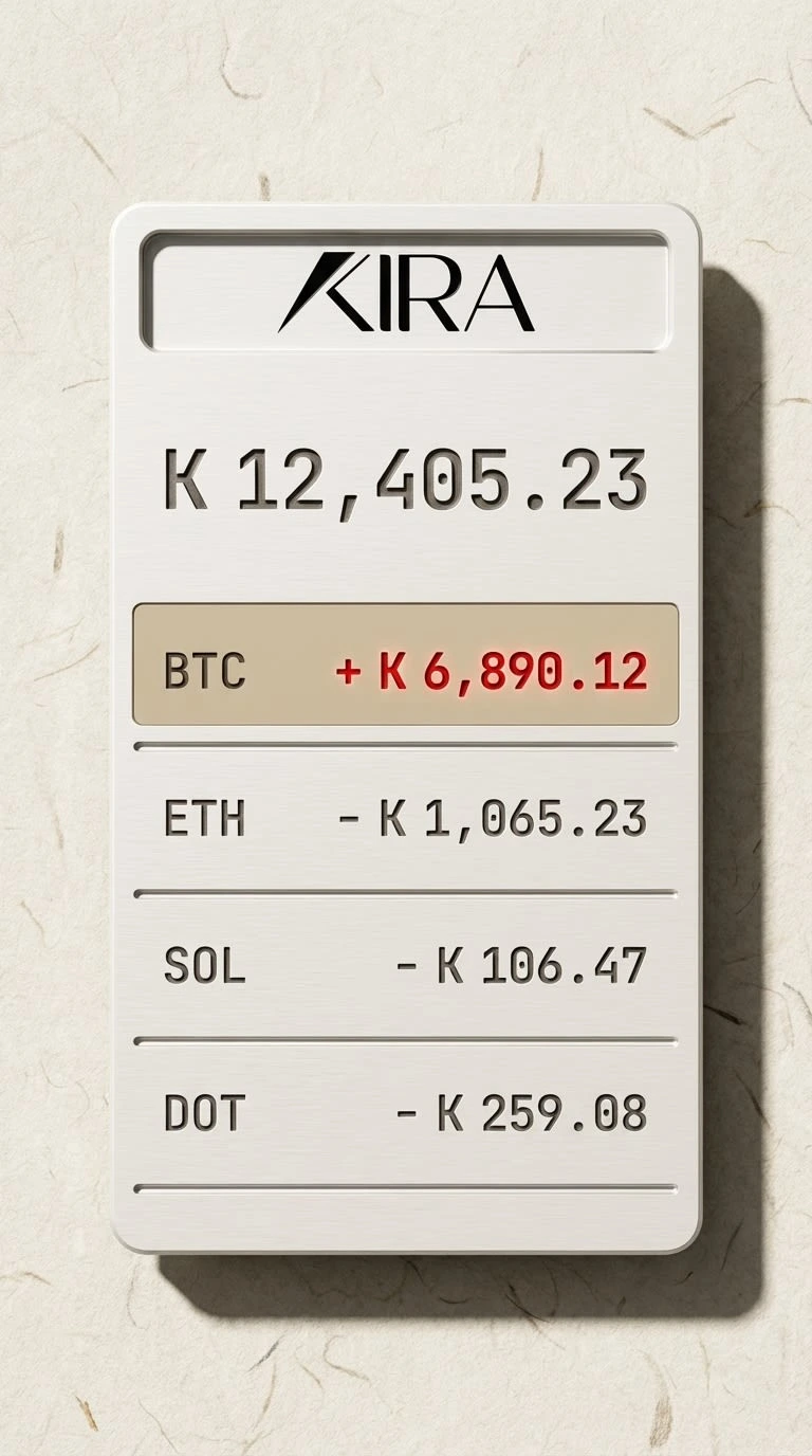 Not Phantom. No purple gradients, no neon, no dark-mode-as-personality. Not Coinbase. No corporate blue, no rounded corners trying to make crypto feel safe. Not a trading app. No candles, no ticker anxiety, no dopamine loops. Not a startup. Kira has no "building the future of finance" energy. It is already built. It is already here.