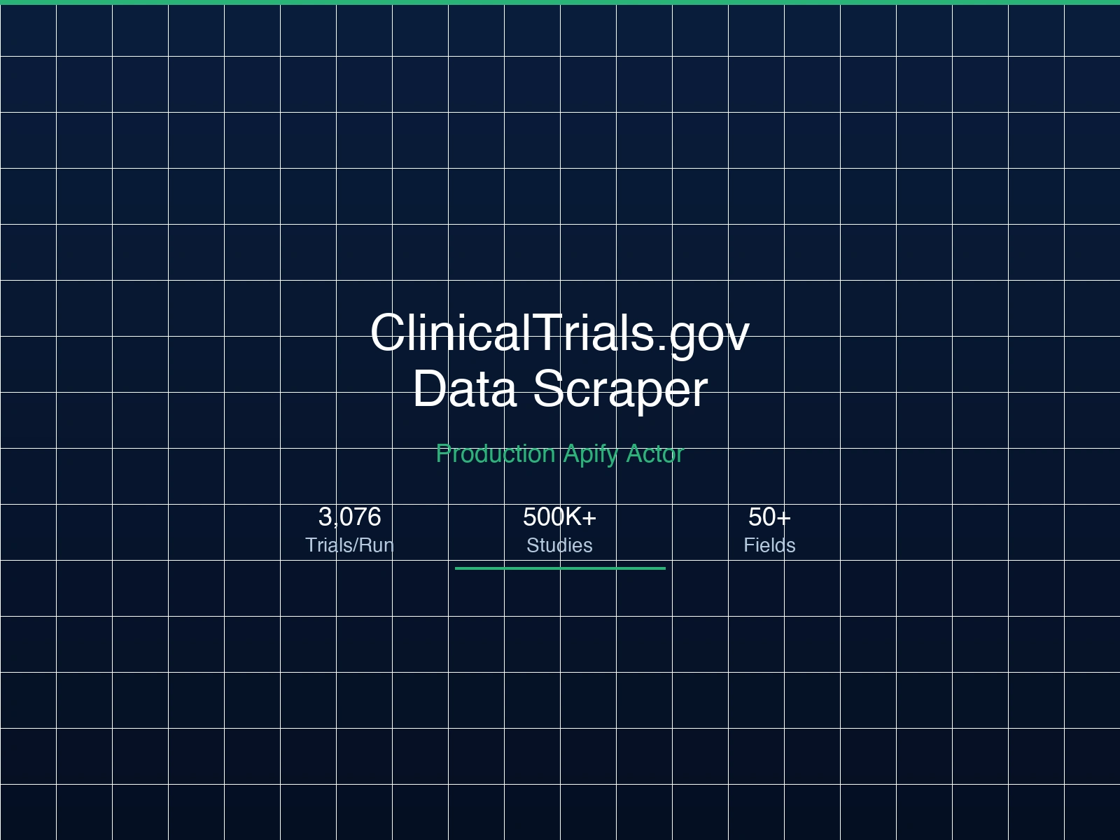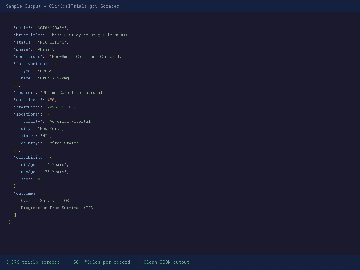 ClinicalTrials.gov Scraper — a production Apify actor that extracts clinical trial data at scale. Scraped 3,076 trials in a single run covering study details, conditions, interventions, eligibility criteria, sponsors, and outcome measures. Built for pharmaceutical researchers, biotech analysts, and healthcare data teams who need structured trial data without manual searching. Outputs clean JSON with full study metadata ready for analysis pipelines.