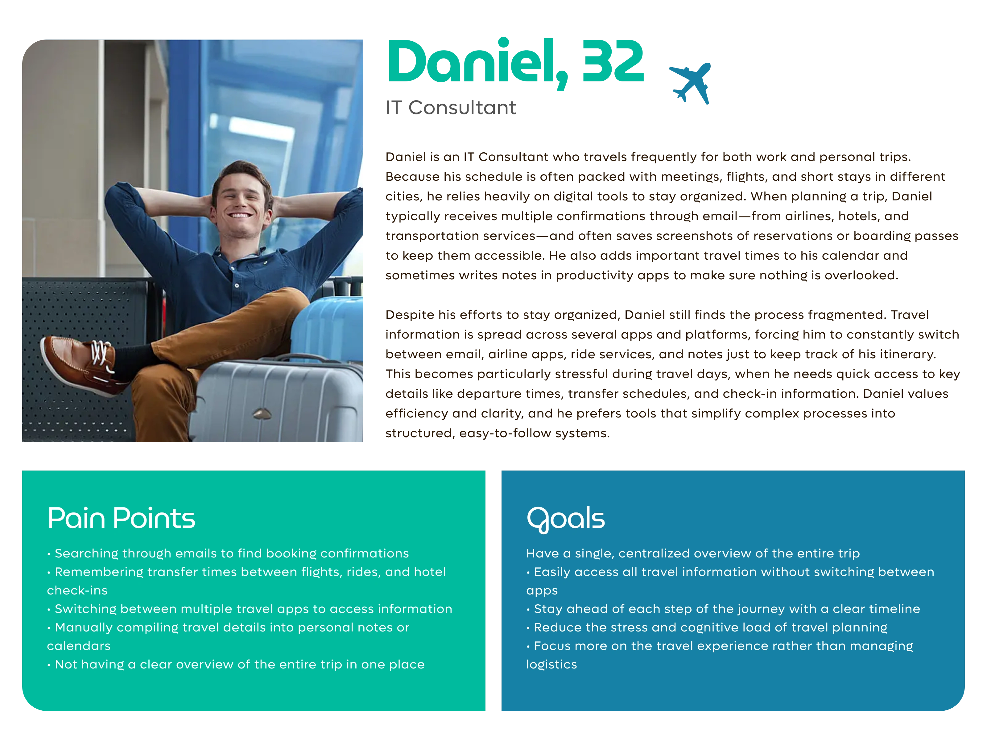 This group includes frequent travelers, digital nomads, business professionals, and detail-oriented vacation planners who often juggle flights, accommodations, transportation and activities. Because they already rely on tools such as planners, calendar apps, and itinerary trackers, they are comfortable using digital systems to stay organized. A timeline-based travel organizer naturally fits into their habits by consolidating travel details into a clear, chronological view of the entire journey.