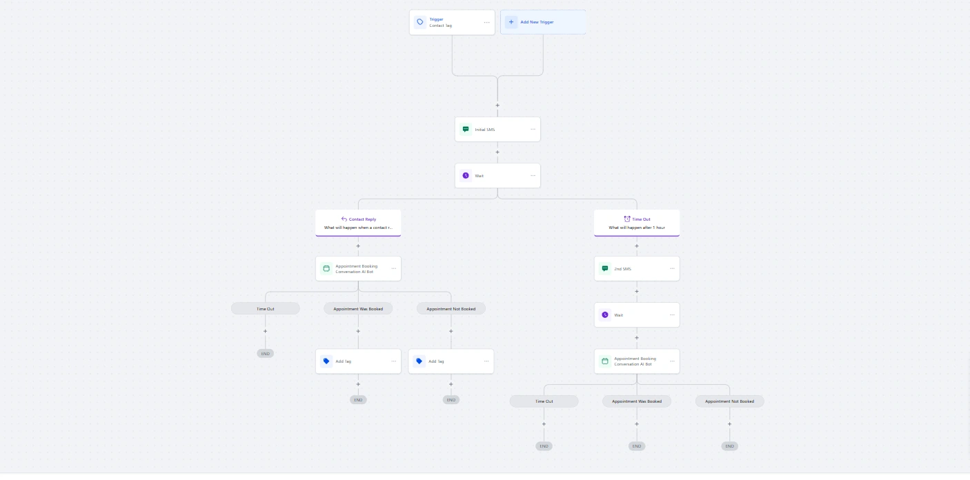IF contact responds within 1 hour → Activate AI Bot → Bot attempts to book appointment (up to 8 messages) IF appointment booked → Add tag: "appointment-booked" → Trigger confirmation workflow IF appointment not booked → Add tag: "reactivation-failed" → Log conversation for analysis