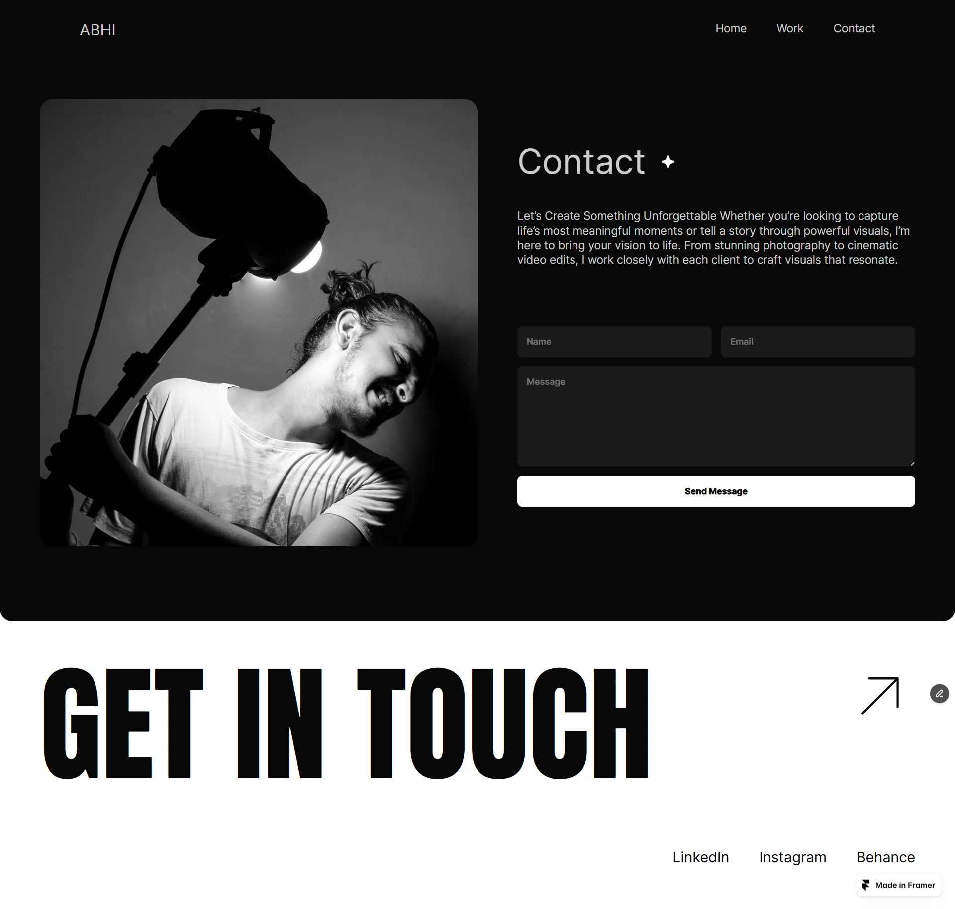 Built a sleek Framer portfolio for photographer & brand designer. Modern design showcases multi-disciplinary skills, boosting client trust & inquiries.