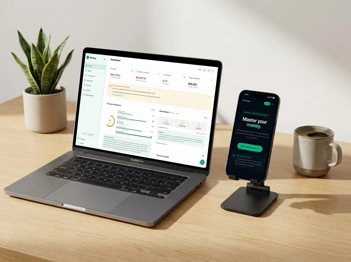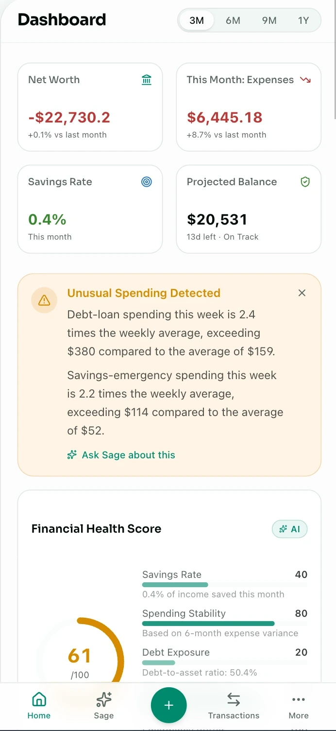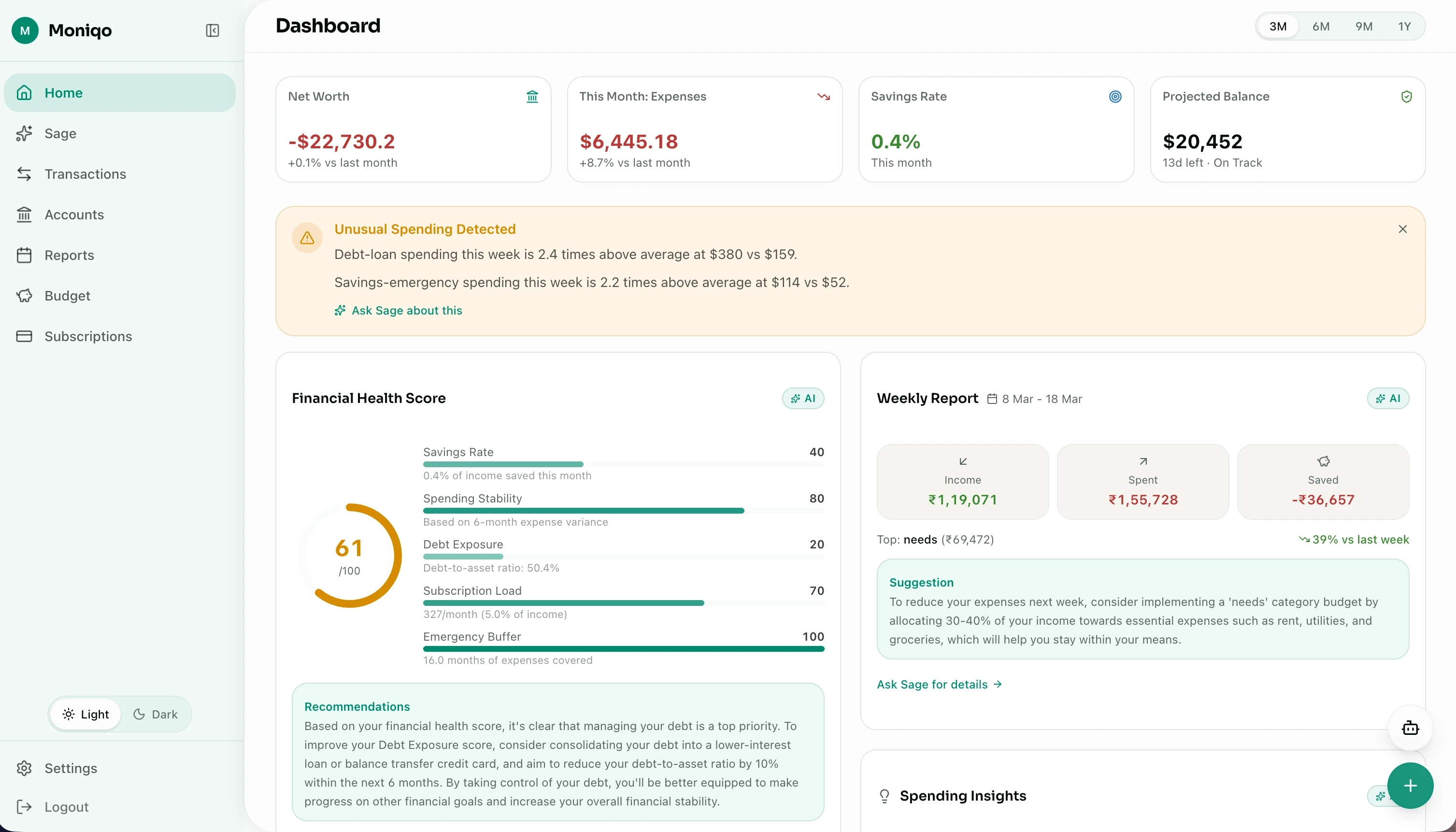A full-stack SaaS with a dedicated AI Financial Chatbot that remembers session context and suggests follow-up questions. Five AI-generated dashboard cards stream independently: Health Score, Cashflow Forecast, Weekly Report, Spending Insights, and real-time Anomaly Detection with alerts.