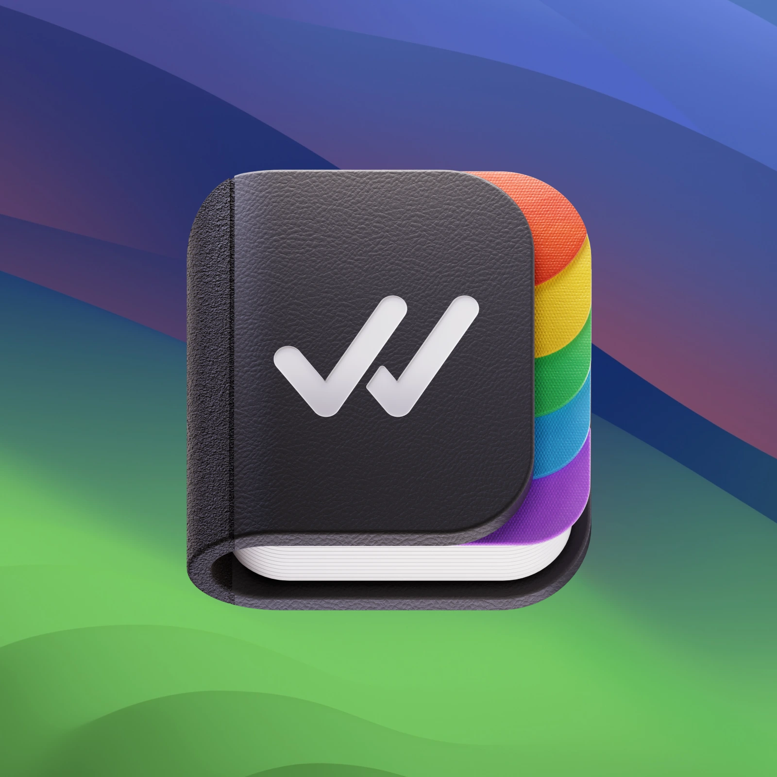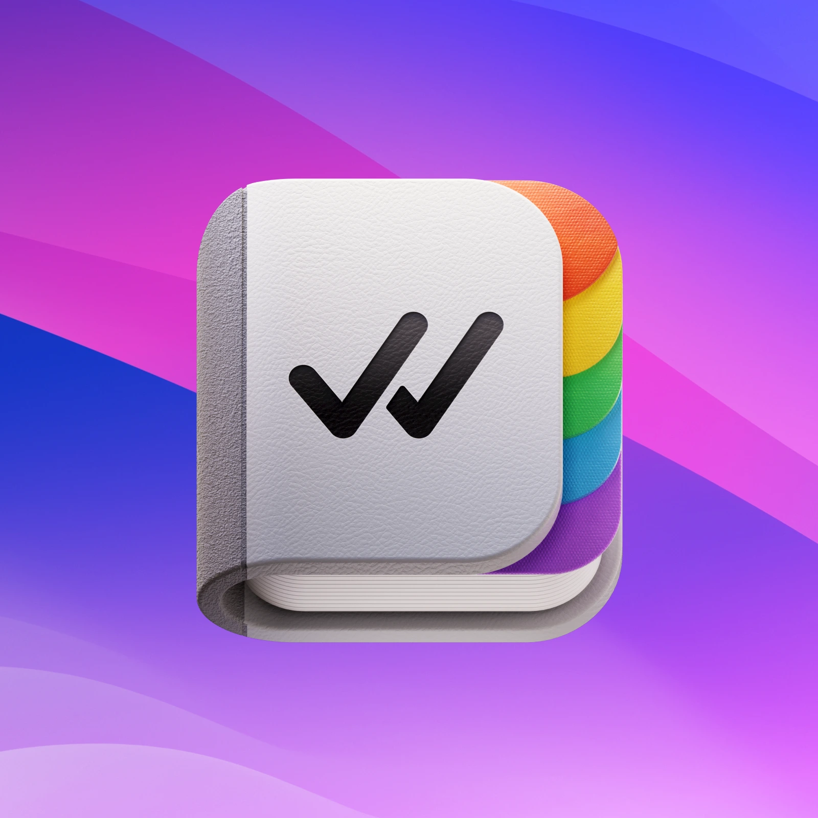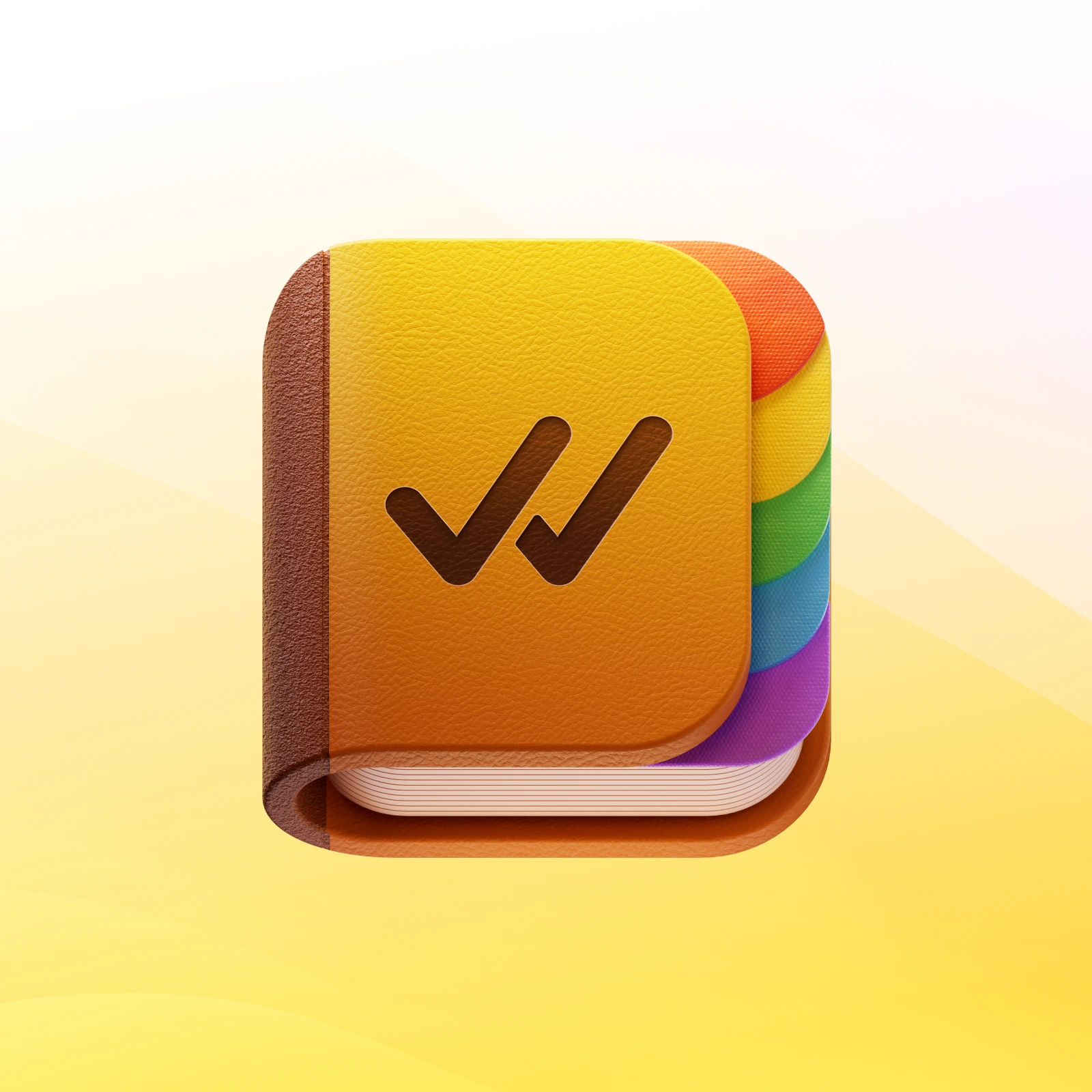 WonderPlan is an advanced planning app. The double checkmarks make out a 'W' emblazoned on the cover of a phsyical planner with multicolored segments.