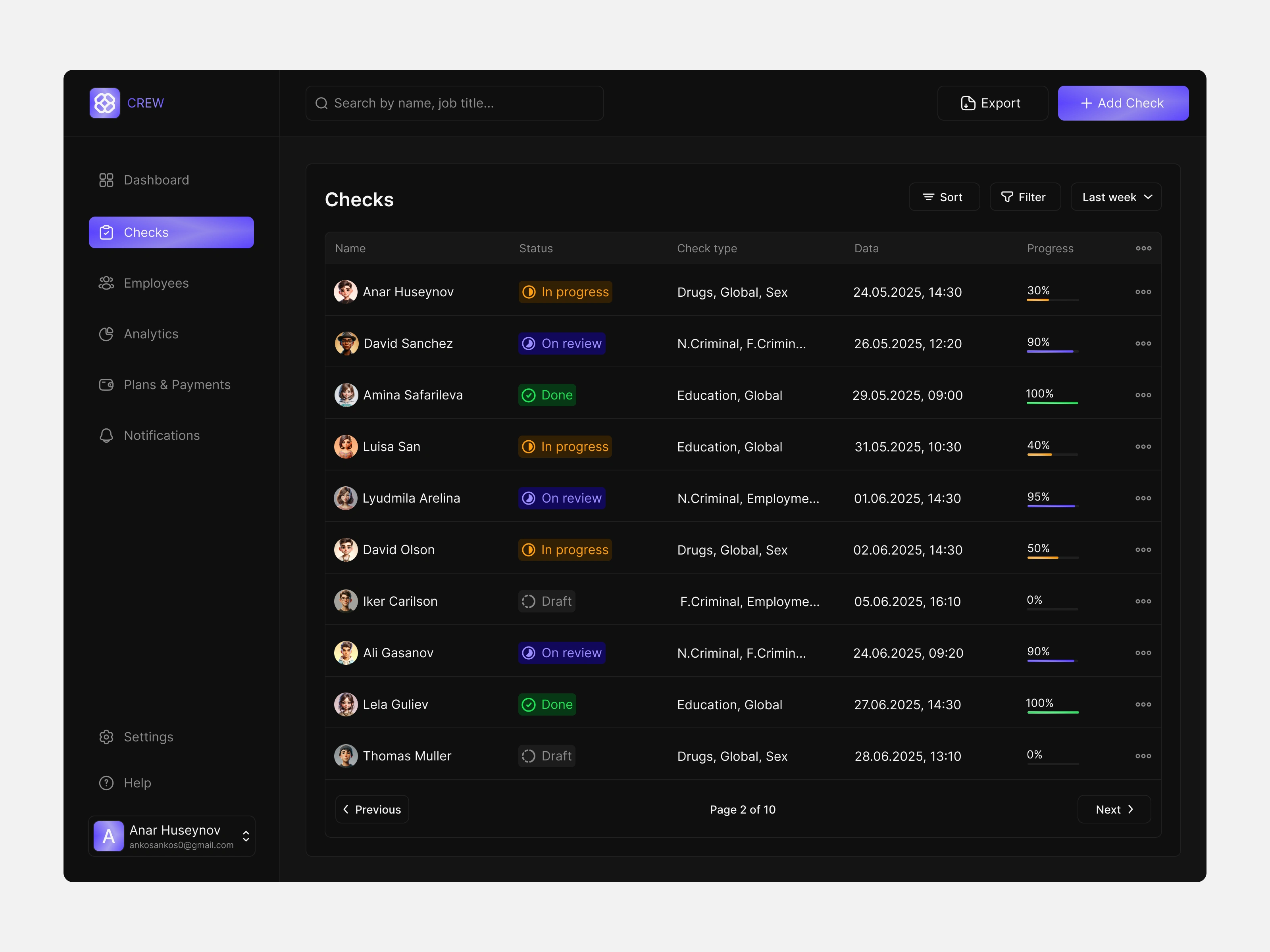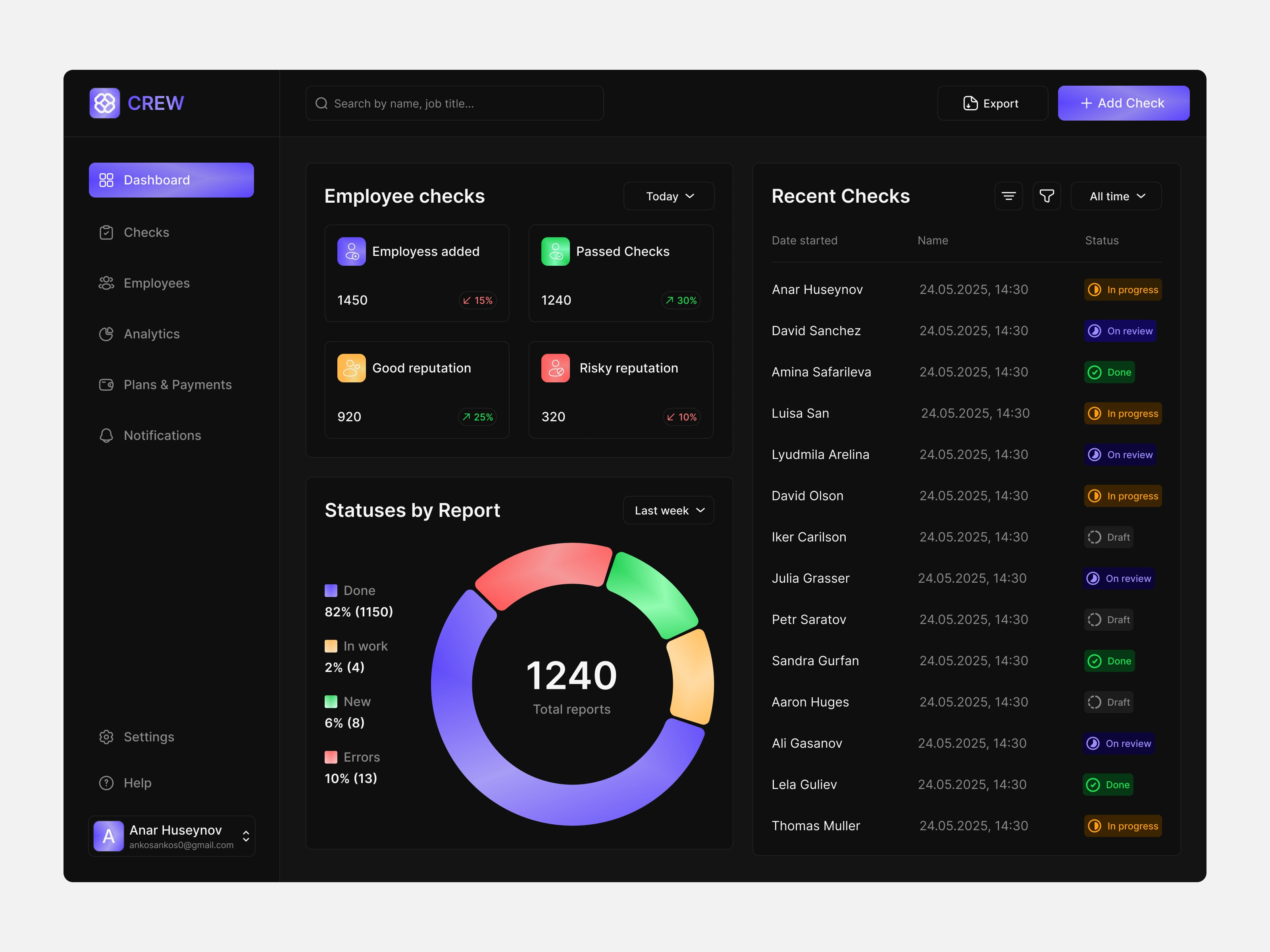 Designed a modern HR dashboard for employee background check management in dark mode.