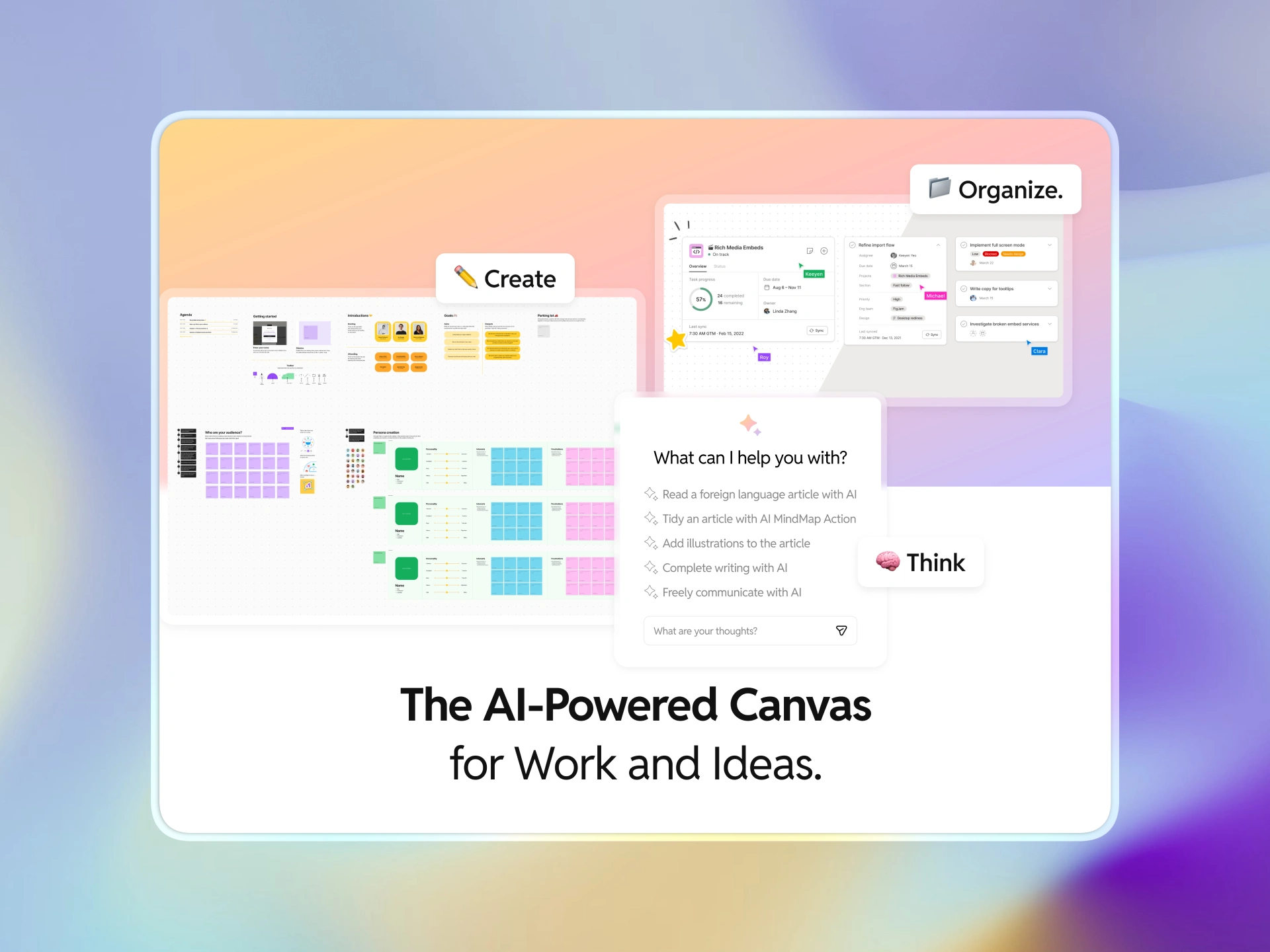 This is the slide that sells HIVE AI to team leads. I pulled a canvas mid-session — multiple named collaborators (Ross, Christian, Frankie, Lena) with their live cursors and colored avatar tags, a reaction wheel mid-interaction (+1s, hearts, stars), sticky notes in a How Might We framework, and service brainstorming tiles populated with real-looking content.
