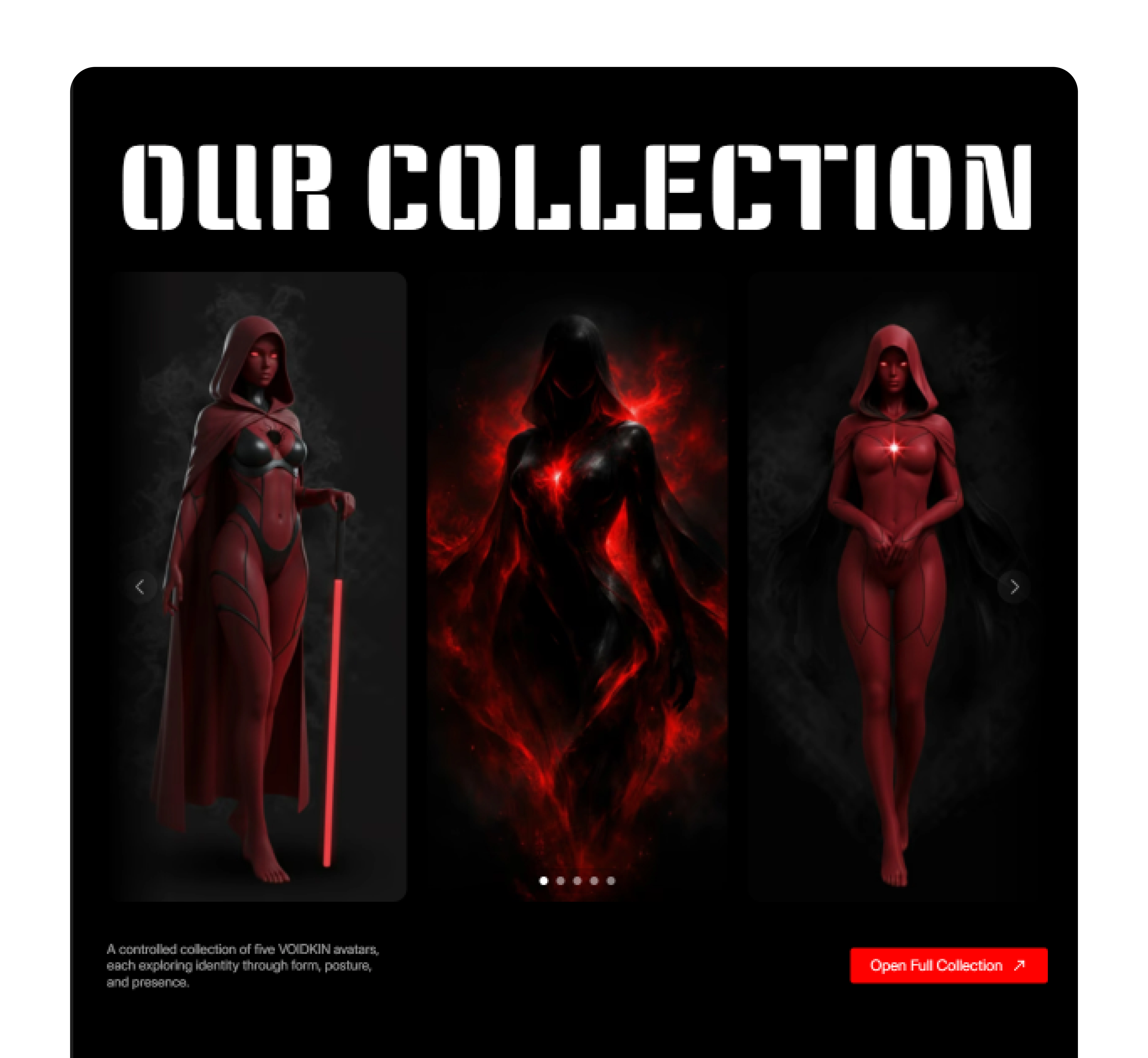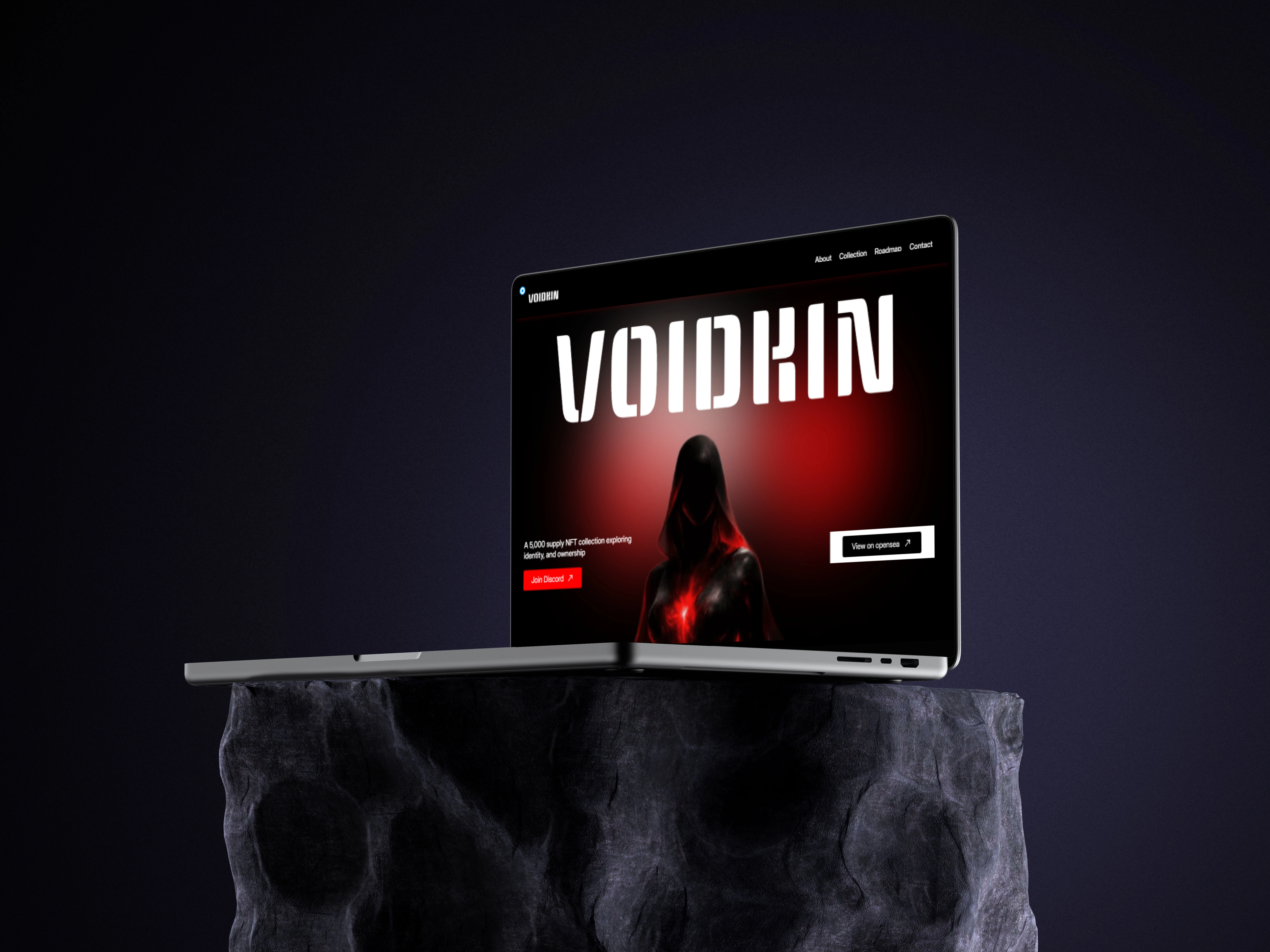 VOIDKIN is a conceptual NFT collection created to explore how strong visual storytelling and motion can elevate a Web3 brand. The goal was to design a bold, immersive landing page that feels premium, mysterious, and modern while remaining simple and responsive.