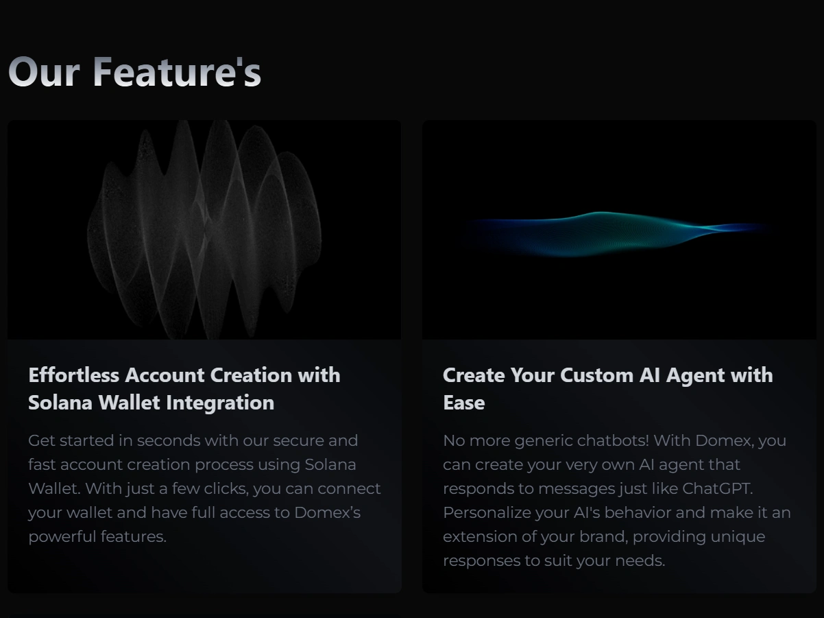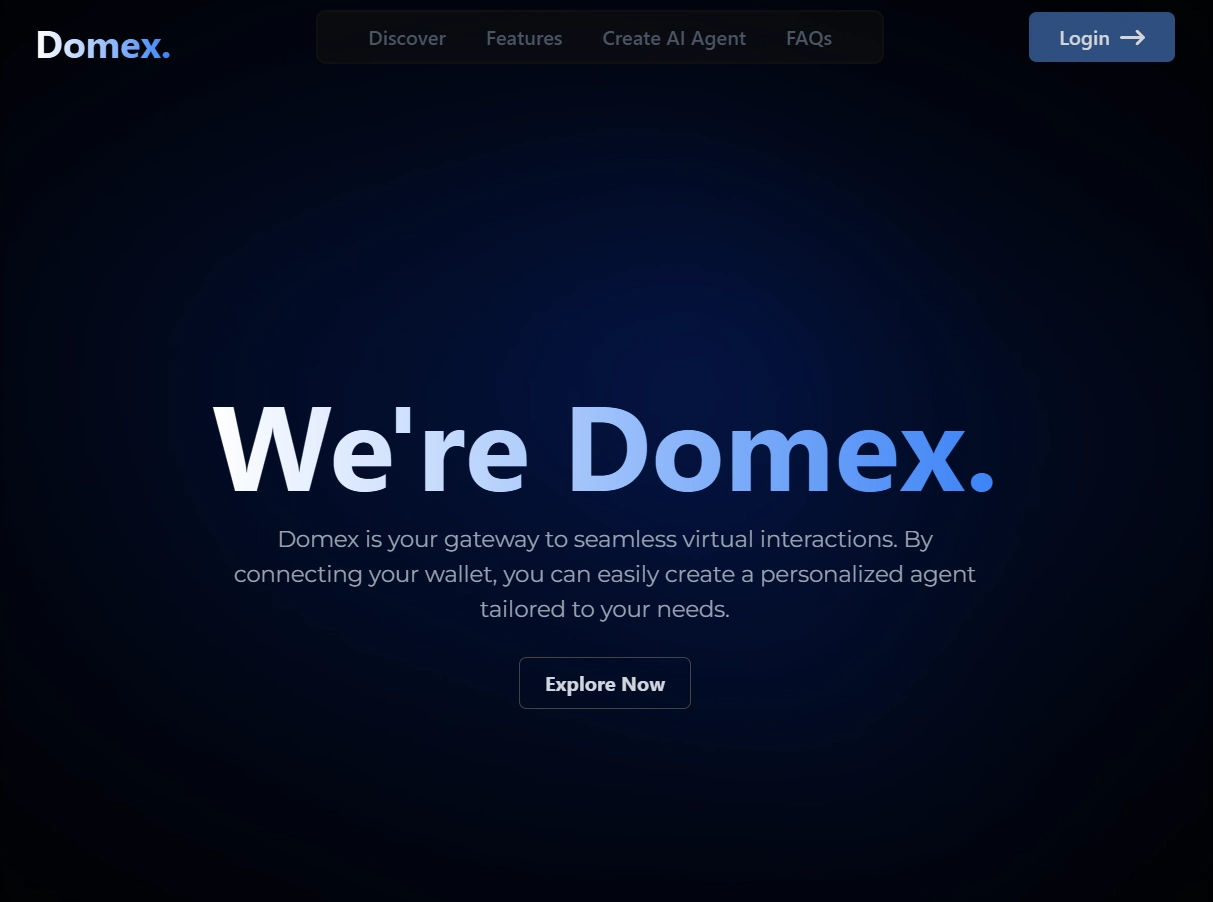 Domex is a modern platform that lets users link digital wallets(Phantom, Solflare, Metamask, etc.,) and create personalized agents for virtual interactions using there tokens. The site is designed to be clean, fast, and secure, making it easy for anyone to connect and transact digitally.
