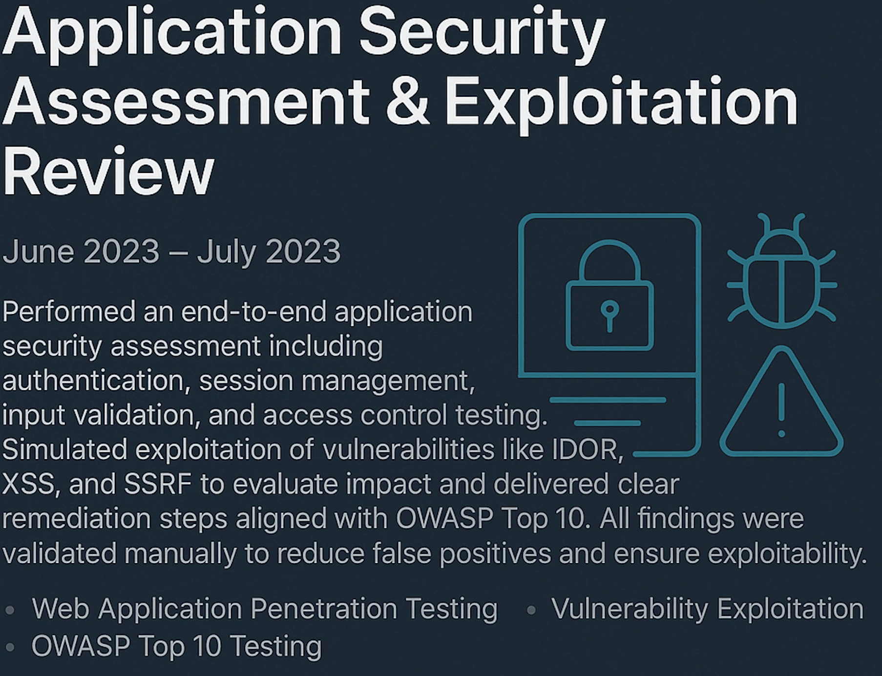 Assessed app security by testing auth, access control, input validation, and OWASP Top 10 risks. Validated exploitability and delivered fixes.