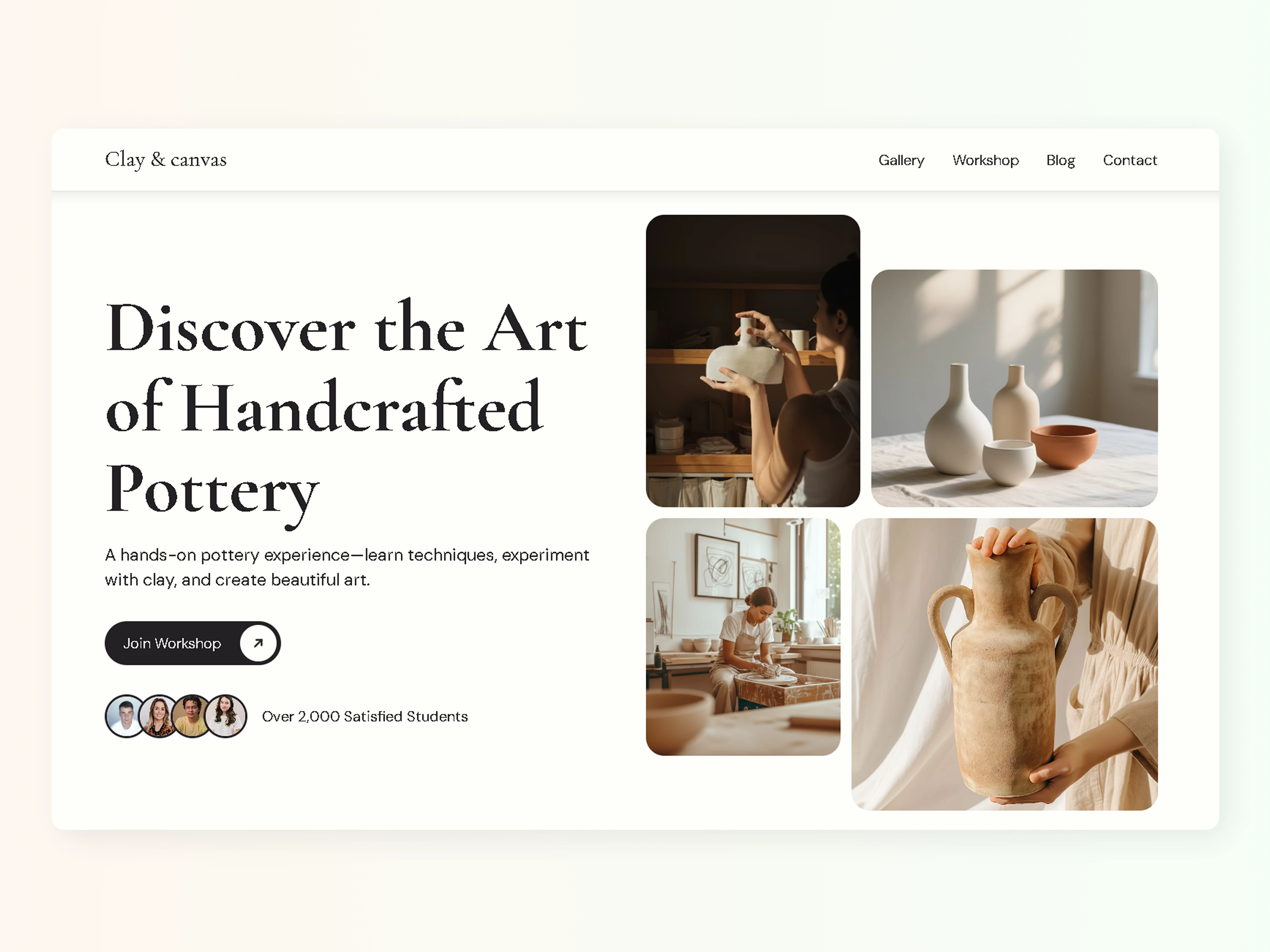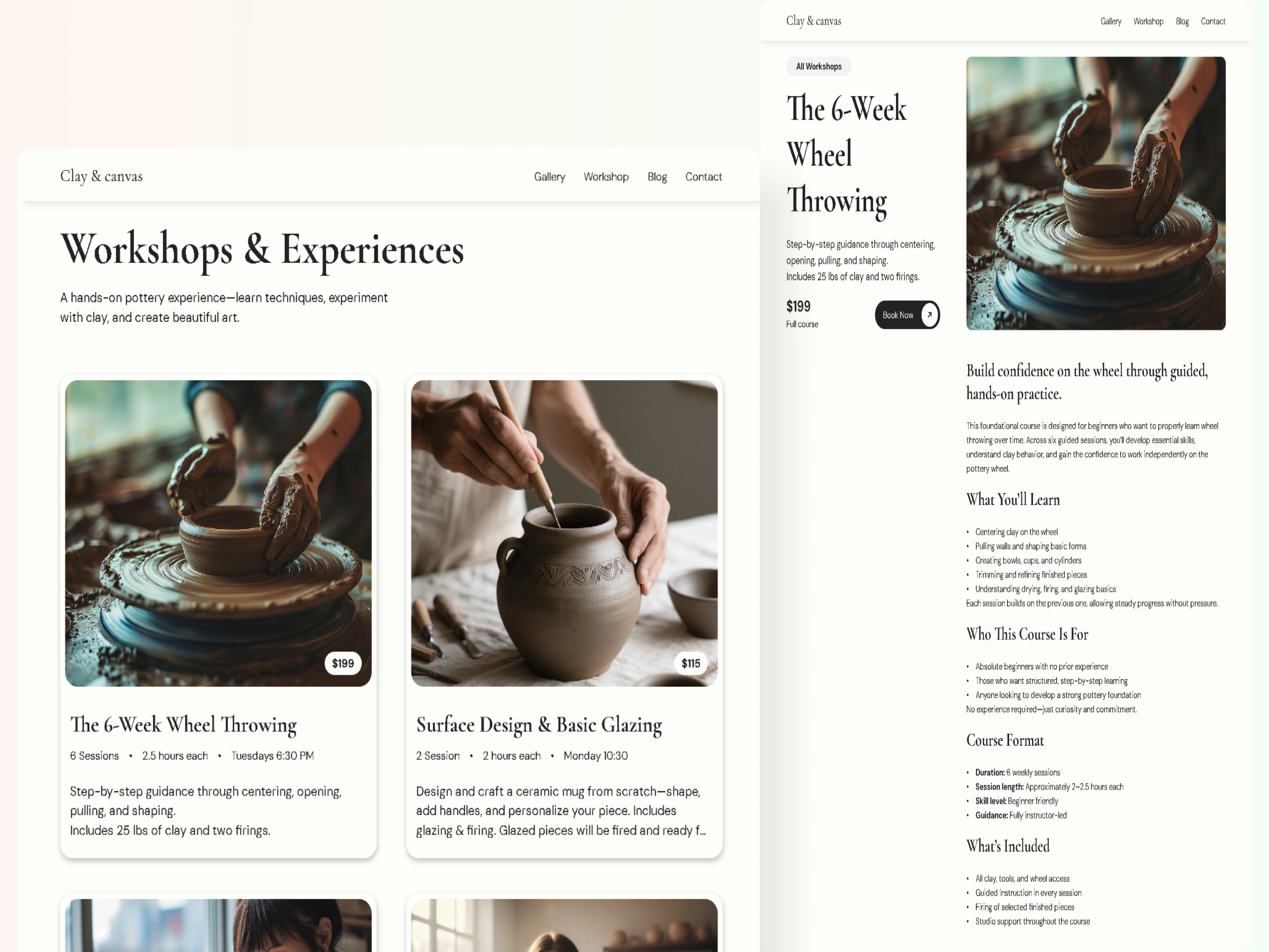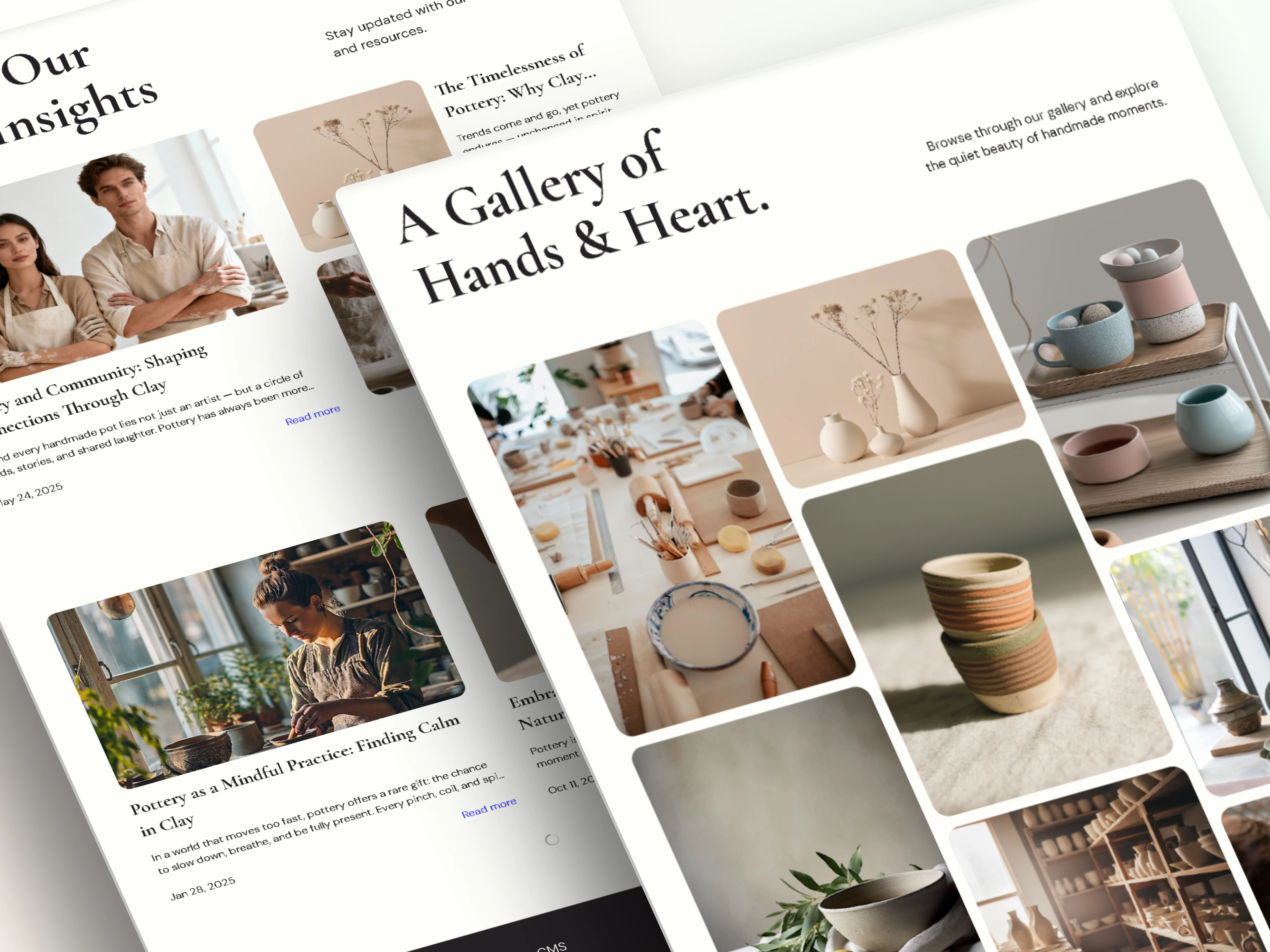Clay & Canvas is a pottery studio offering hands-on classes and creative workshops. The goal was to design a website that captures the tactile, calming experience of working with clay while making it easy for users to explore and join classes.