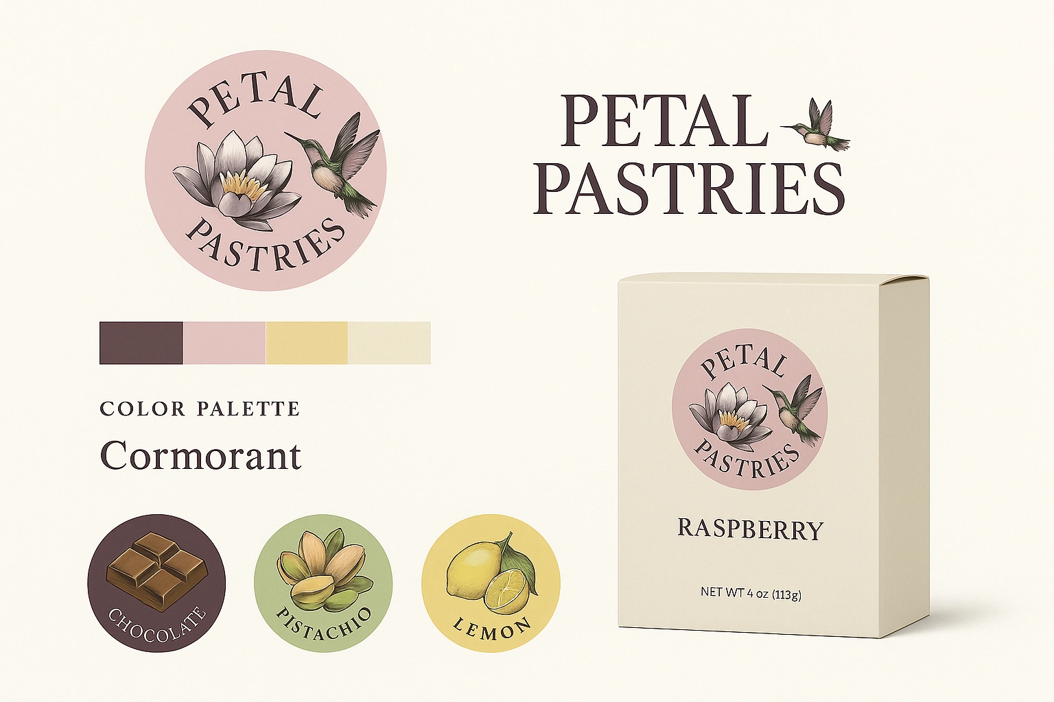 Created Petal Pastries’ brand identity with logos, labels, and packaging that highlight elegance, artistry, and artisanal quality.