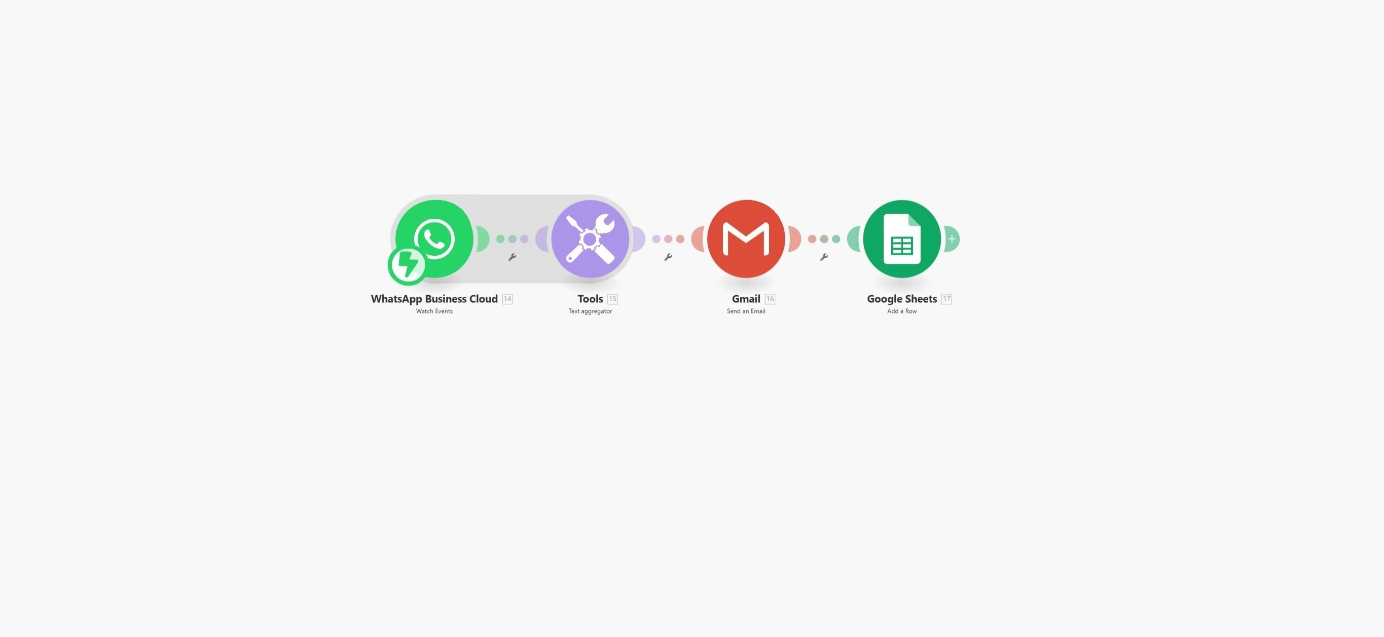 I developed an automation that collects and organizes WhatsApp Business Cloud messages. The workflow aggregates incoming messages, sends them via Gmail in a structured format to the responsible person or team, and stores all message details in Google Sheets for tracking and analysis.